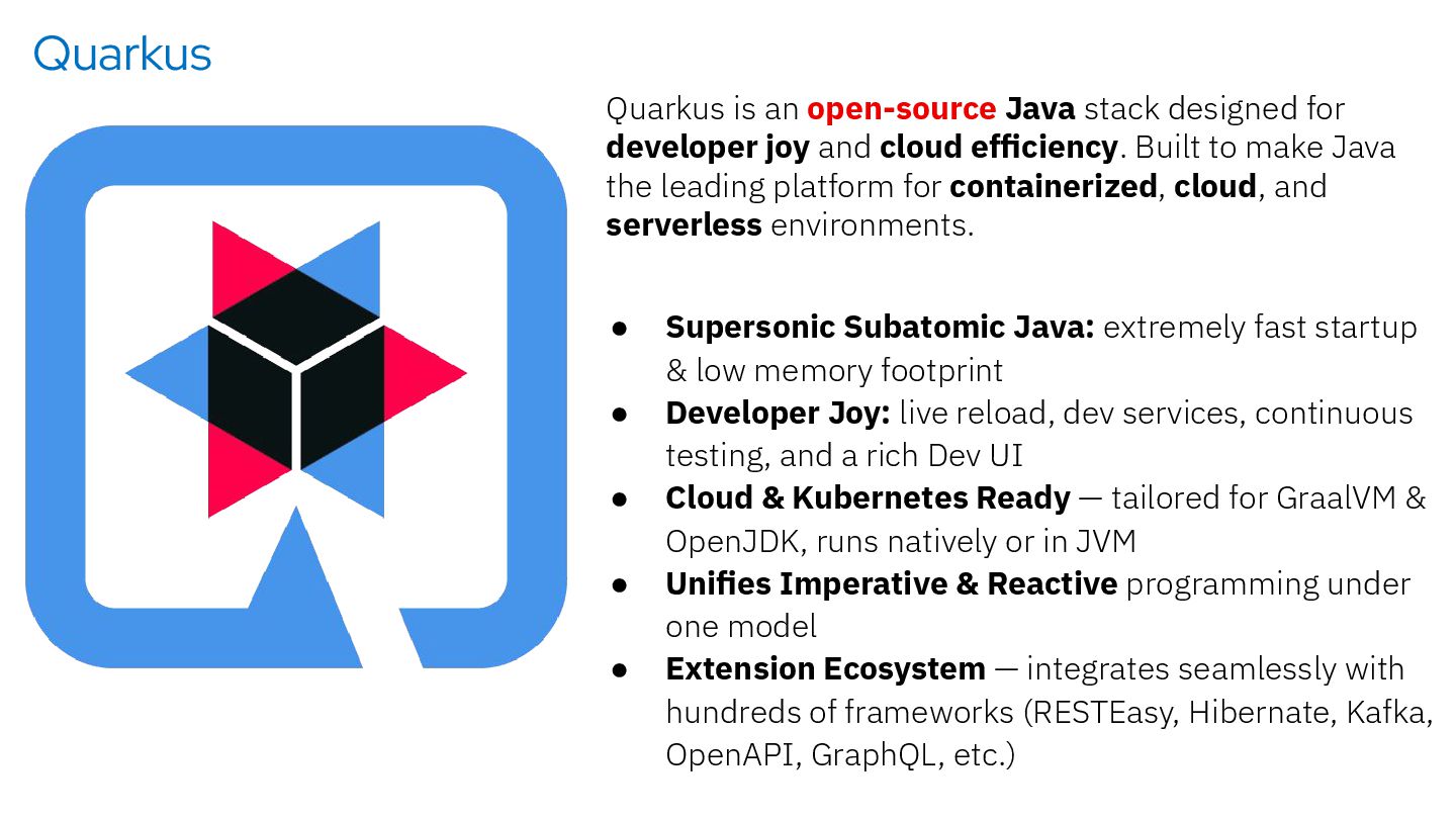 Quarkus is an open-source Java stack designed for developer joy and cloud efficiency. Built to make Java the leading platform for containerized, cloud, and serverless environments.