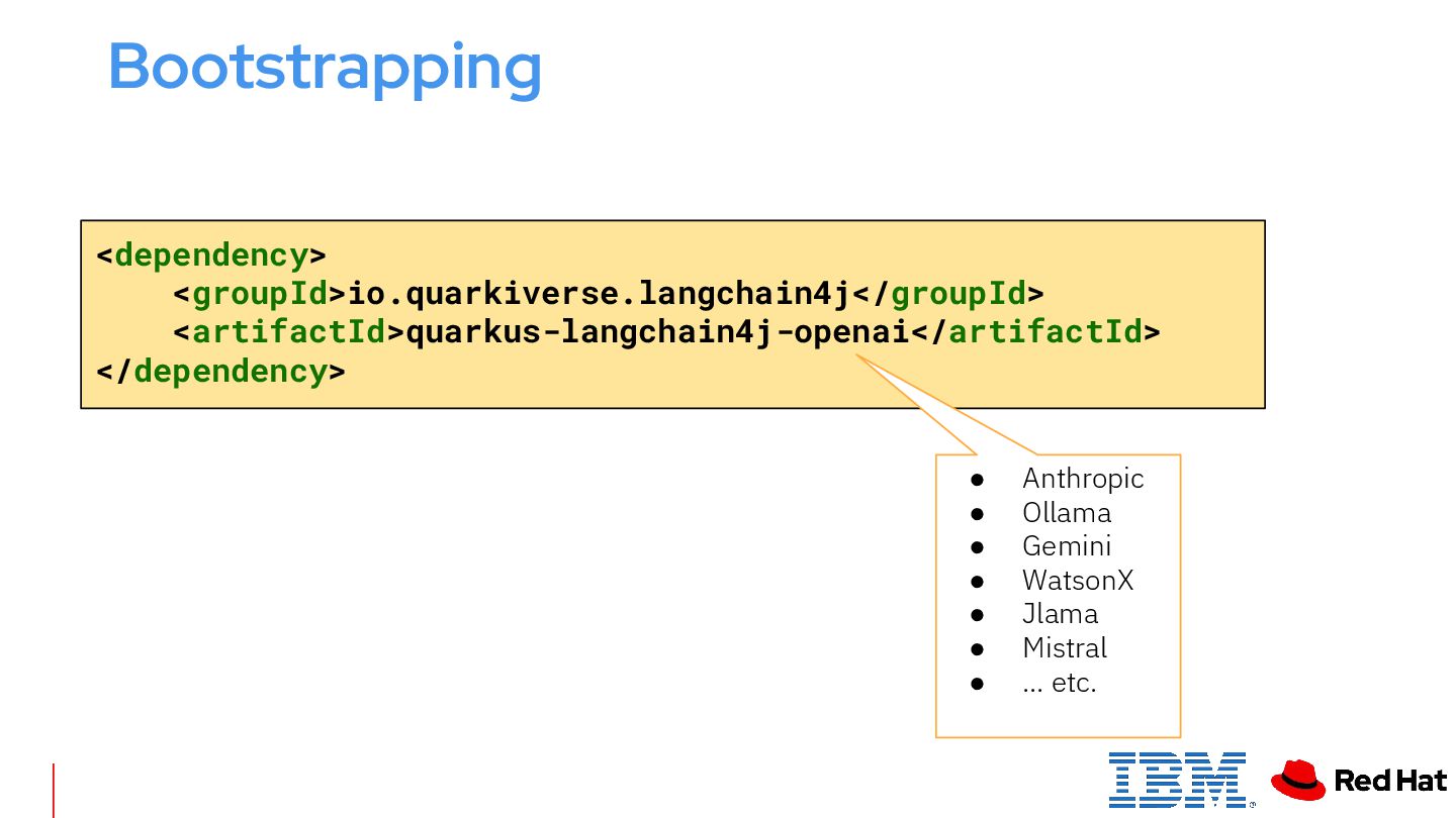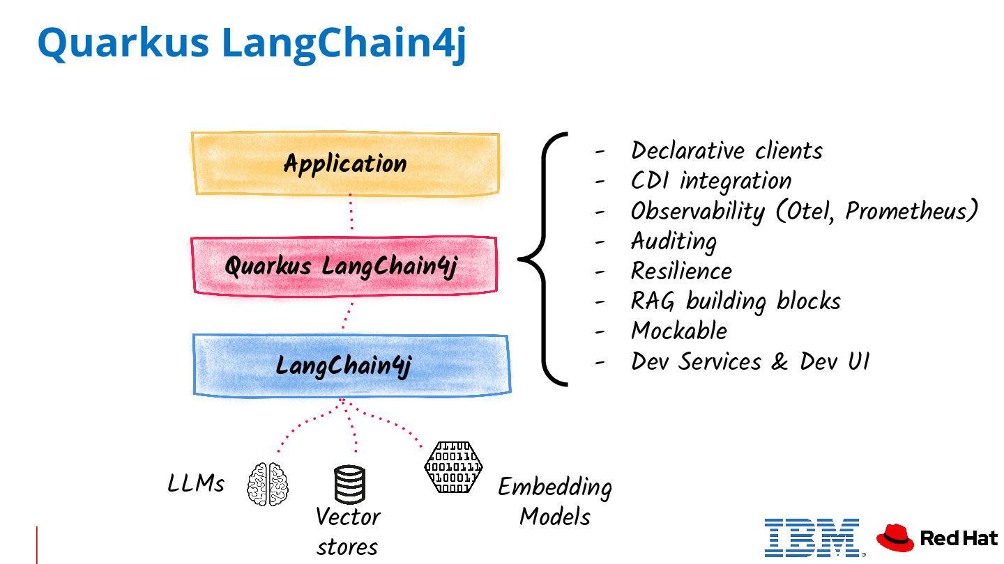 Models - Declarative clients - CDI integration - Observability (Otel, Prometheus) - Auditing - Resilience - RAG building blocks - Mockable - Dev Services & Dev UI