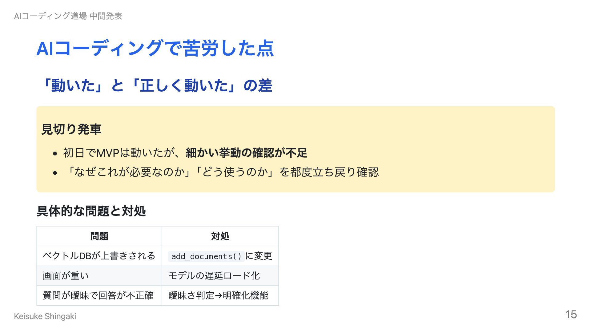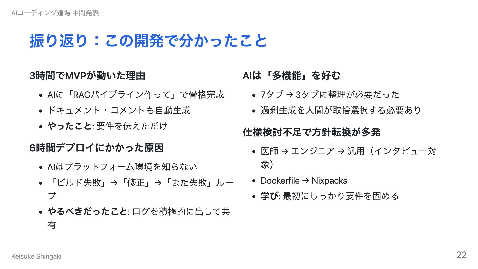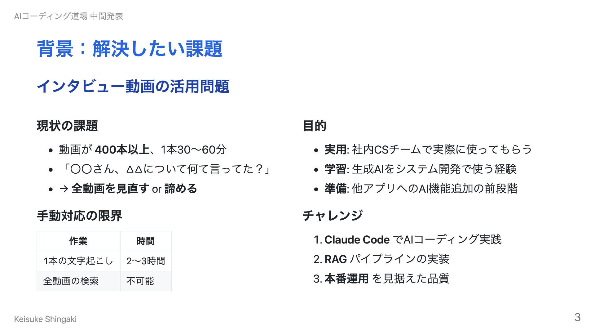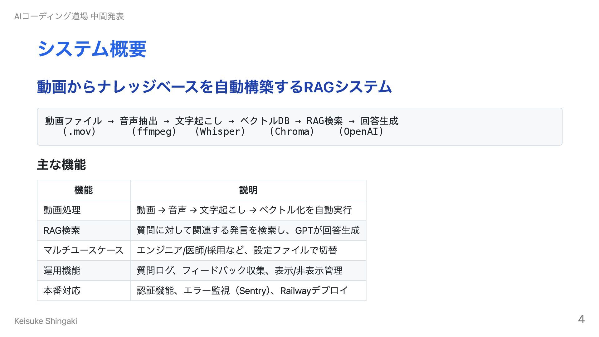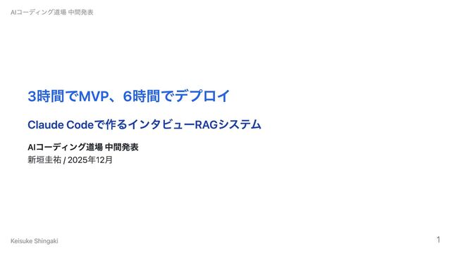 AIコーディング道場勉強会 #5(2025/12/9)の発表資料です。 Claude Codeを使って、インタビュー動画をRAG検索可能なナレッジベースに変換するシステムを開発しました。初日3時間でMVP完成、本番デプロイに6時間かかった経緯と、AIコーディングの実践的な知見を共有します。 技術スタック: LangChain / faster-whisper / Chroma / GPT-4.1-mini / Streamlit / Railway
