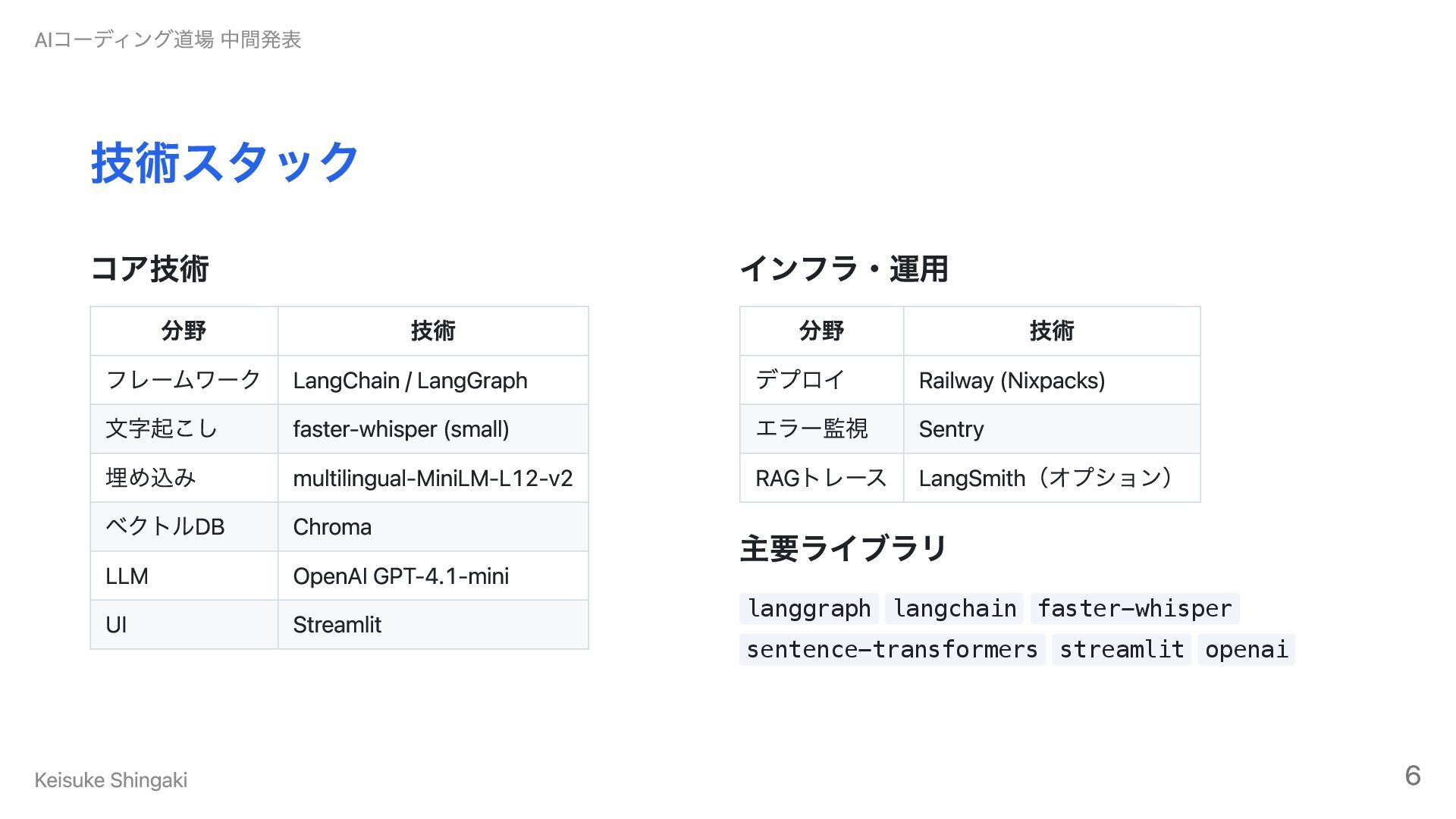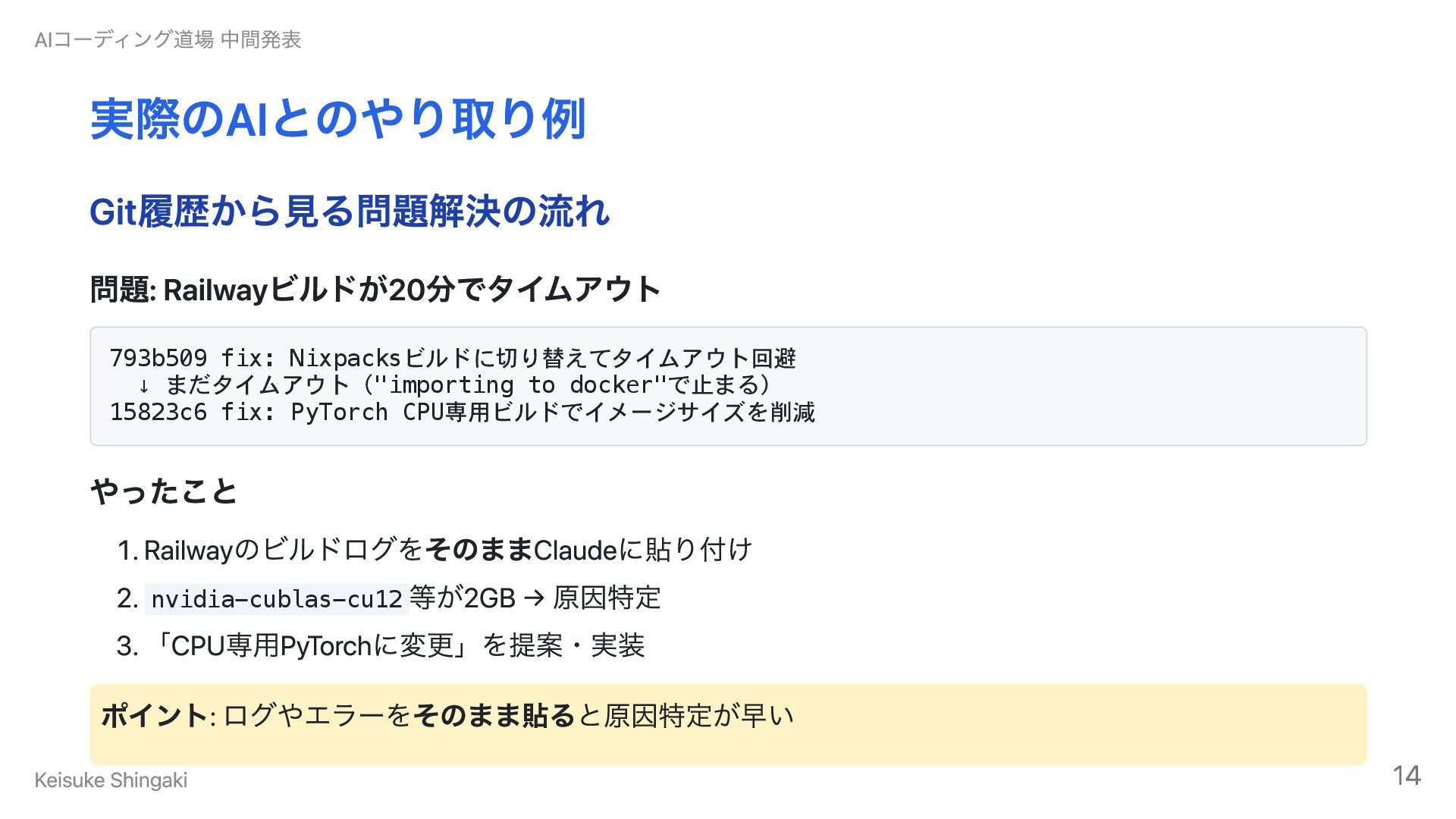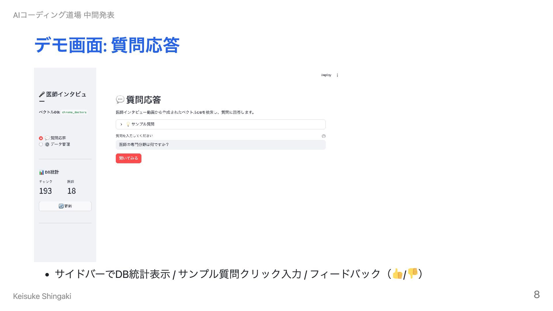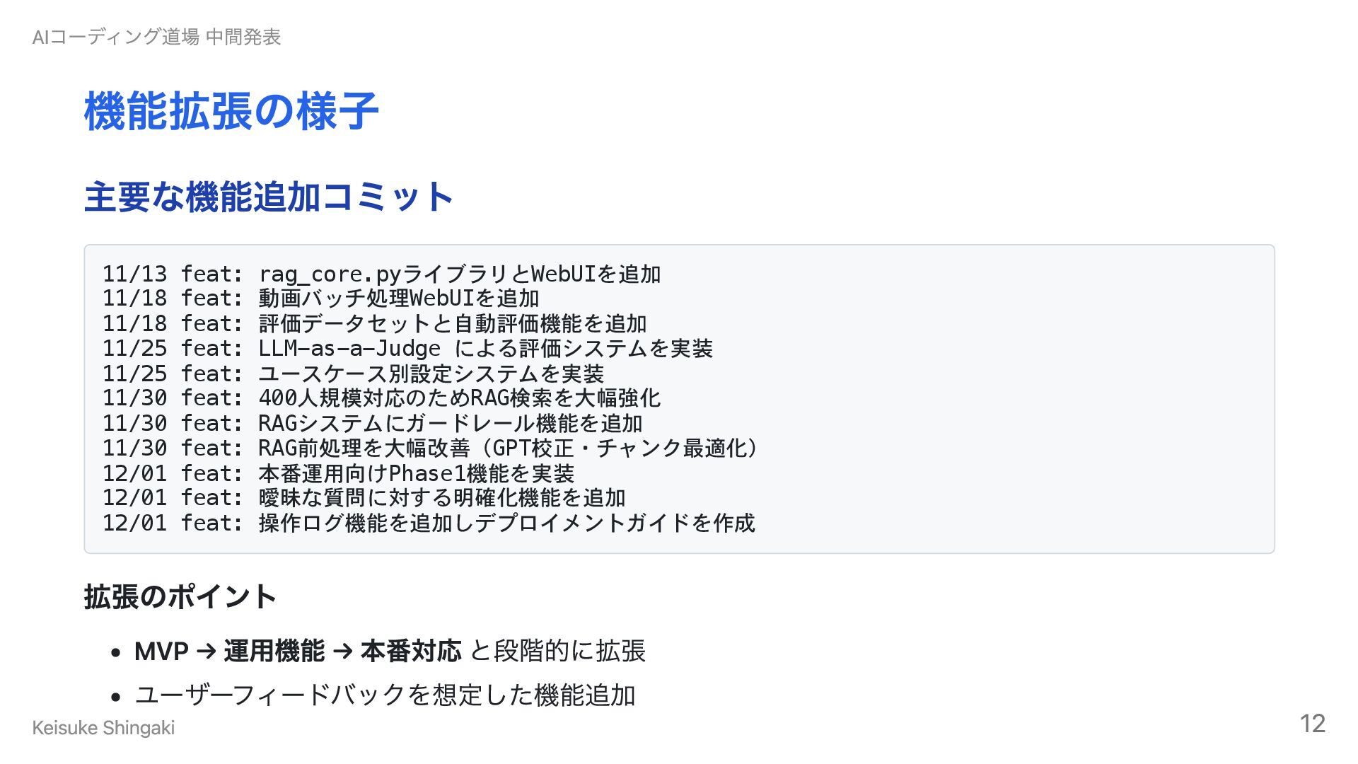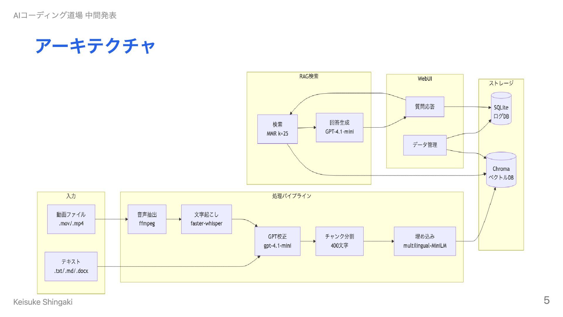 AIコーディング道場勉強会 #5(2025/12/9)の発表資料です。 Claude Codeを使って、インタビュー動画をRAG検索可能なナレッジベースに変換するシステムを開発しました。初日3時間でMVP完成、本番デプロイに6時間かかった経緯と、AIコーディングの実践的な知見を共有します。 技術スタック: LangChain / faster-whisper / Chroma / GPT-4.1-mini / Streamlit / Railway