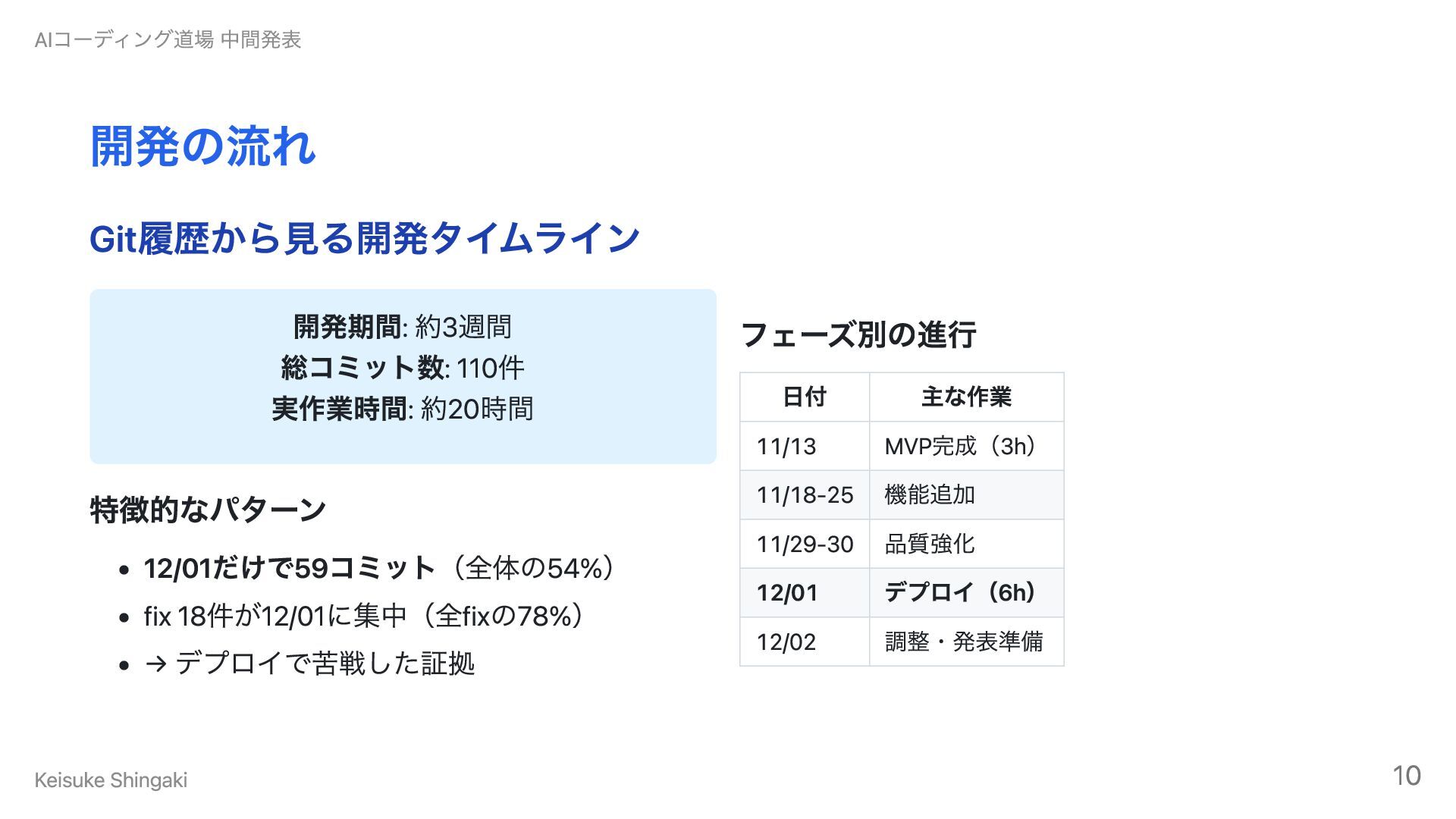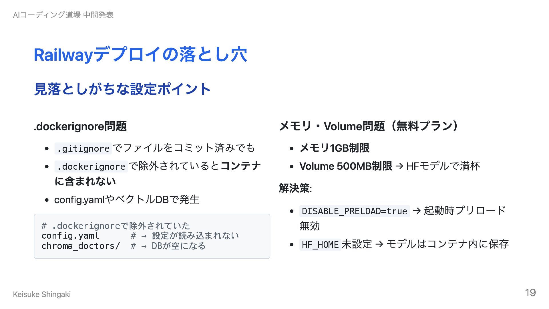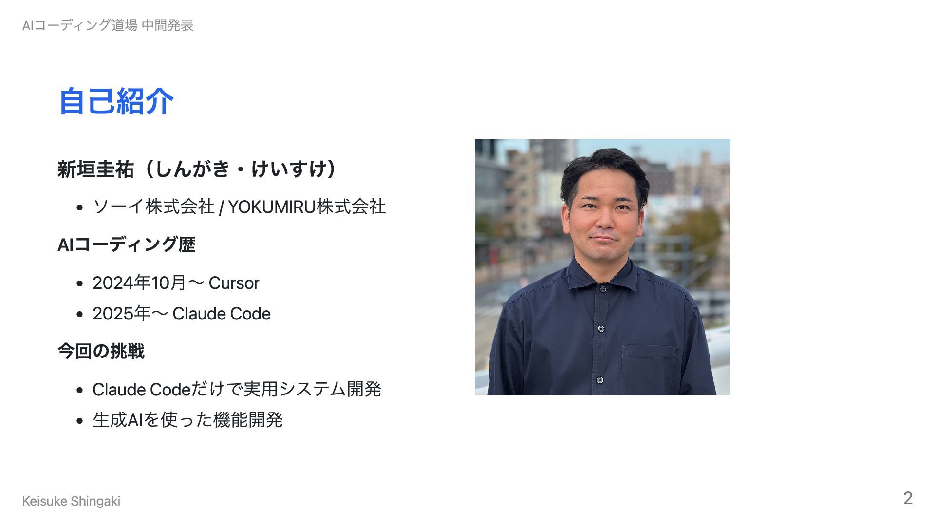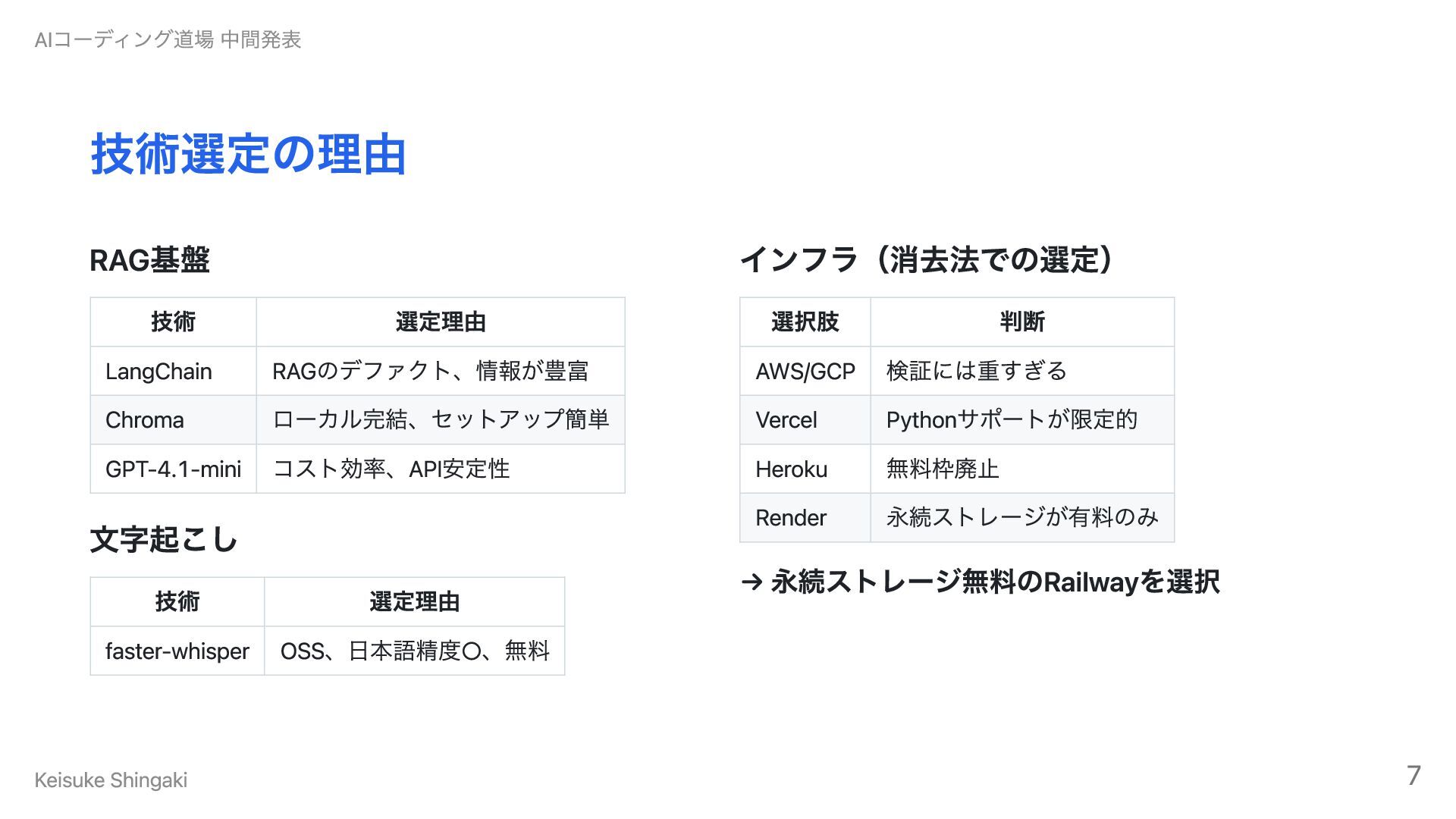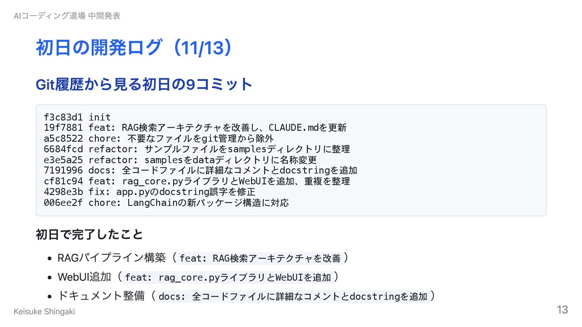 AIコーディング道場勉強会 #5(2025/12/9)の発表資料です。 Claude Codeを使って、インタビュー動画をRAG検索可能なナレッジベースに変換するシステムを開発しました。初日3時間でMVP完成、本番デプロイに6時間かかった経緯と、AIコーディングの実践的な知見を共有します。 技術スタック: LangChain / faster-whisper / Chroma / GPT-4.1-mini / Streamlit / Railway