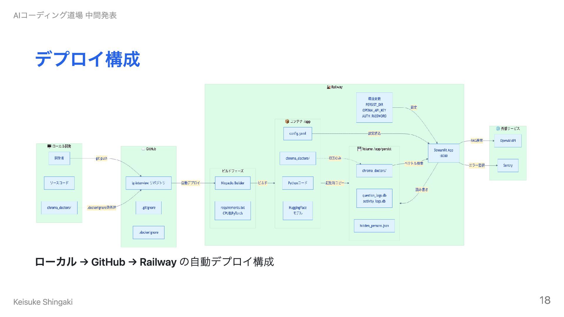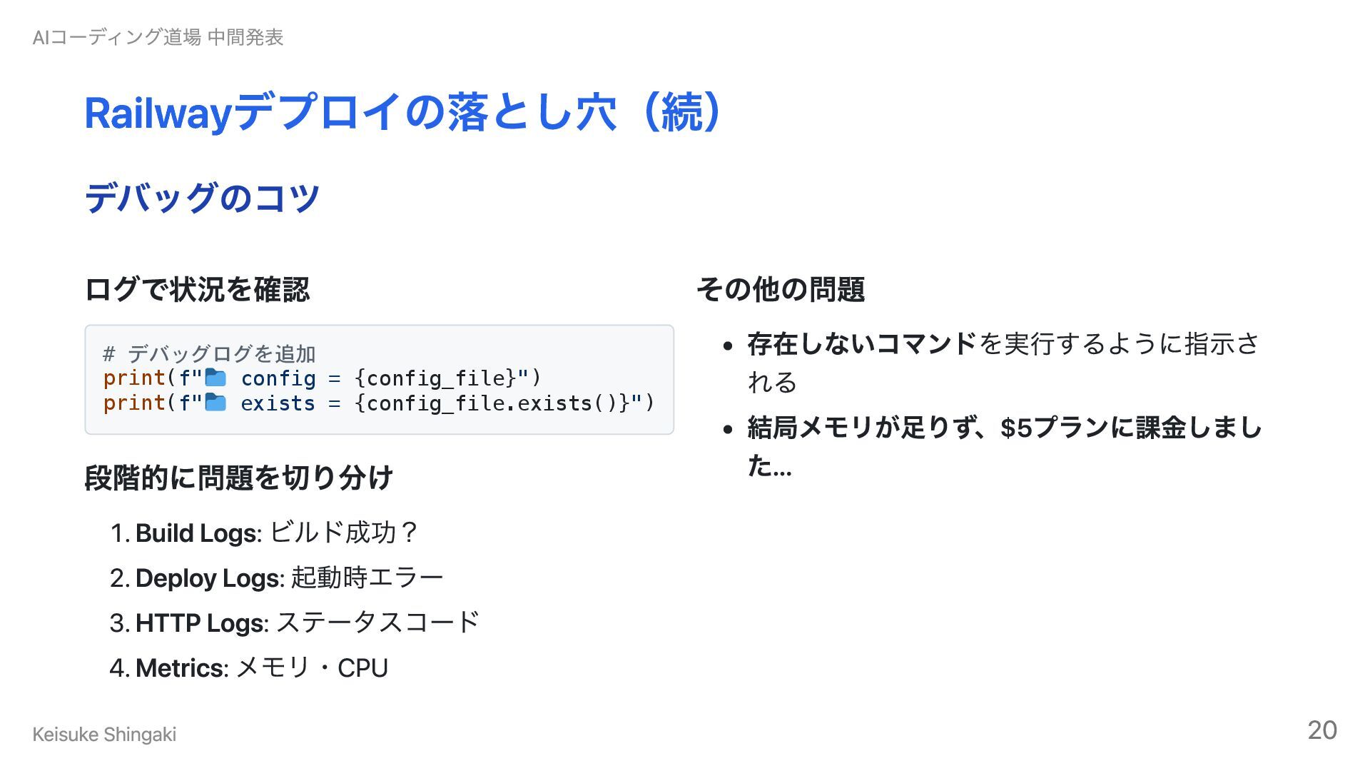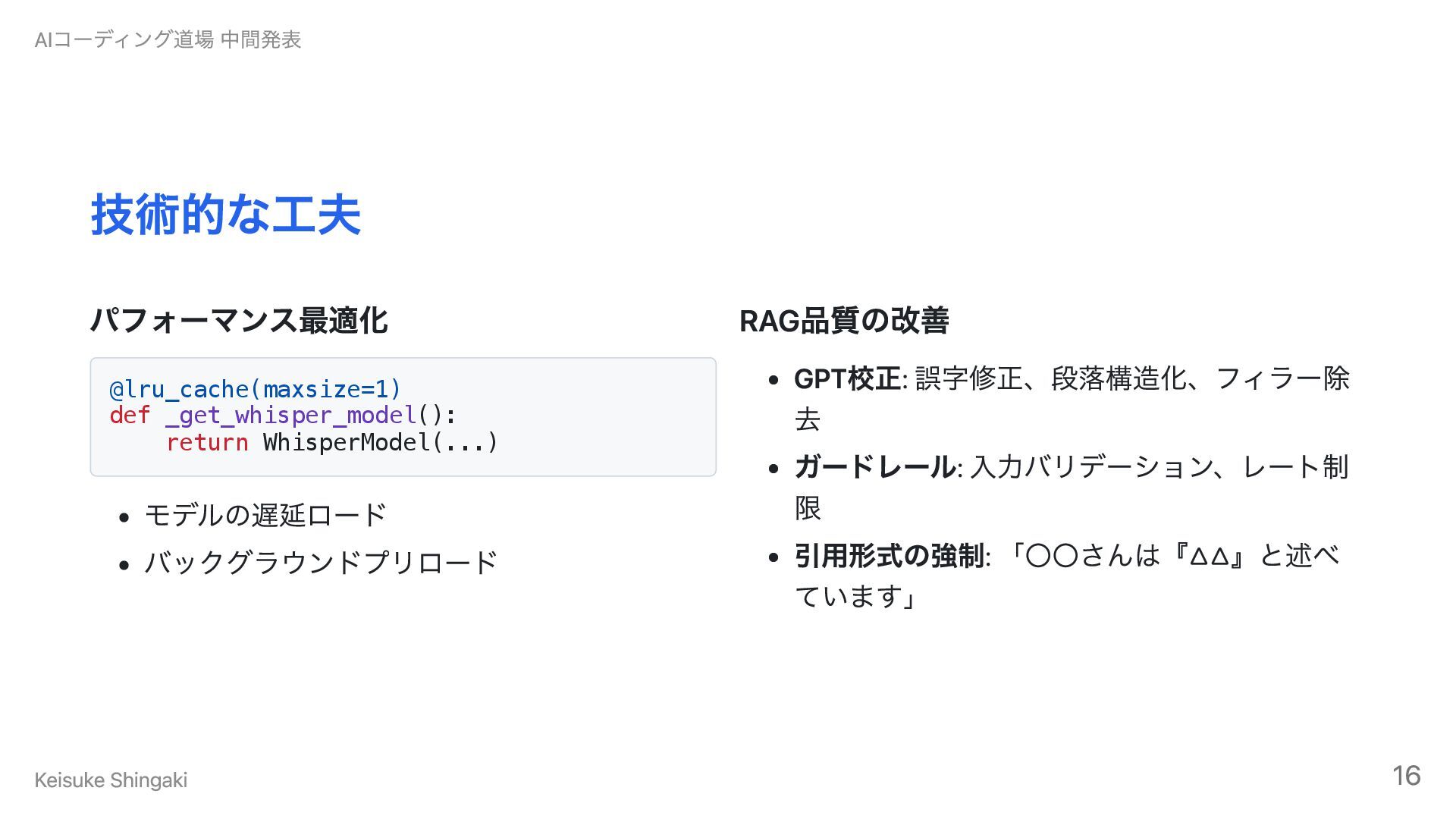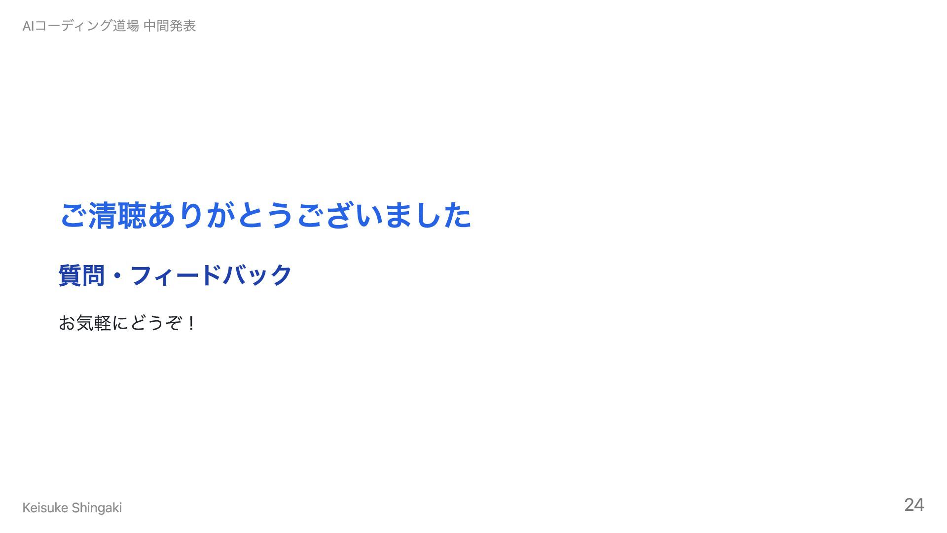 AIコーディング道場勉強会 #5(2025/12/9)の発表資料です。 Claude Codeを使って、インタビュー動画をRAG検索可能なナレッジベースに変換するシステムを開発しました。初日3時間でMVP完成、本番デプロイに6時間かかった経緯と、AIコーディングの実践的な知見を共有します。 技術スタック: LangChain / faster-whisper / Chroma / GPT-4.1-mini / Streamlit / Railway