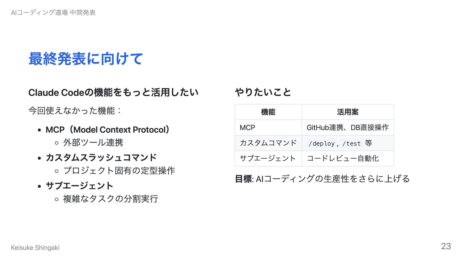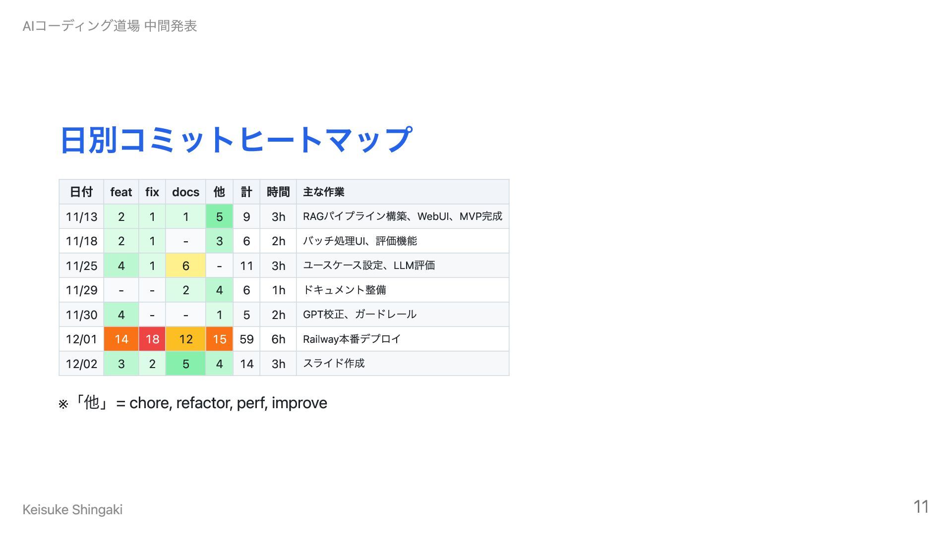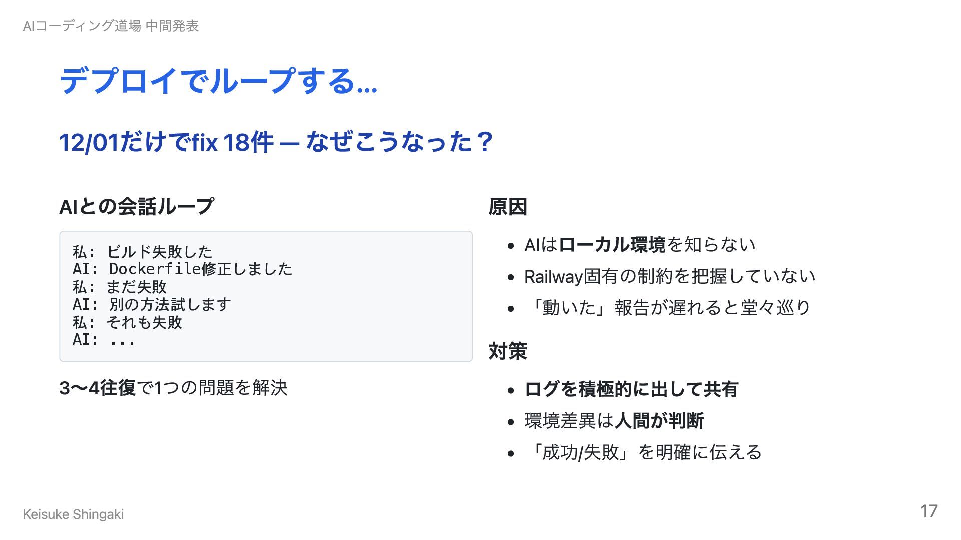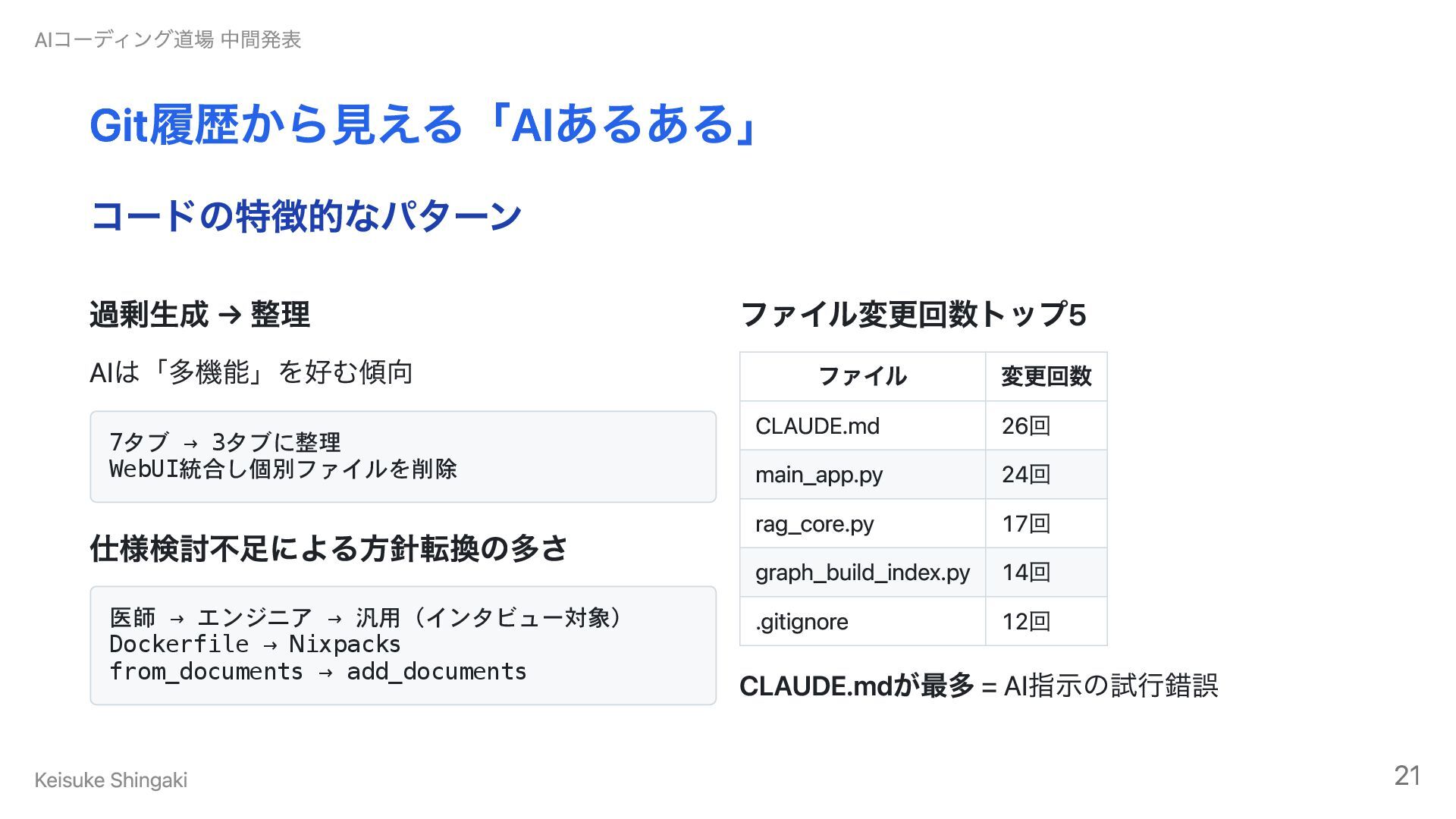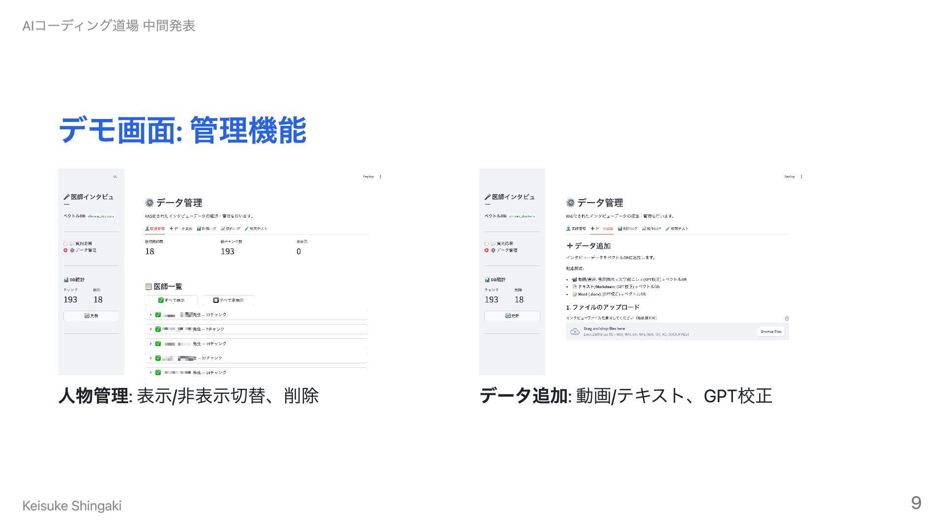 AIコーディング道場勉強会 #5(2025/12/9)の発表資料です。 Claude Codeを使って、インタビュー動画をRAG検索可能なナレッジベースに変換するシステムを開発しました。初日3時間でMVP完成、本番デプロイに6時間かかった経緯と、AIコーディングの実践的な知見を共有します。 技術スタック: LangChain / faster-whisper / Chroma / GPT-4.1-mini / Streamlit / Railway