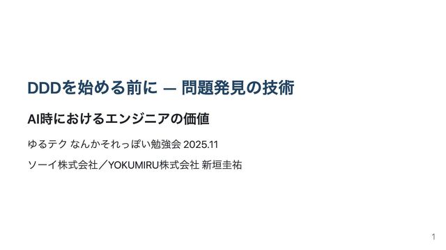 DDDを始める前に ― 問題発見の技術 AI時におけるエンジニアの価値 ゆるテク なんかそれっぽい勉強会 2025.11 ソーイ株式会社/YOKUMIRU株式会社 新垣圭祐 1
