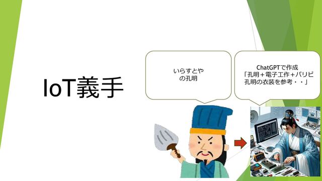 IoT義手 ChatGPTで作成 「孔明+電子工作+パリピ 孔明の衣装を参考・・」 いらすとや の孔明