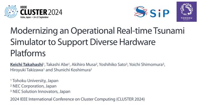 Keichi Takahashi, Takashi Abe, Akihiro Musa, Yoshihiko Sato, Yoichi Shimomura, Hiroyuki Takizawa, Shunichi Koshimura, “Modernizing an Operational Real-time Tsunami Simulator to Support Diverse Hardware Platforms,” International Conference on Cluster Computing (CLUSTER 2024), Sep. 2024.