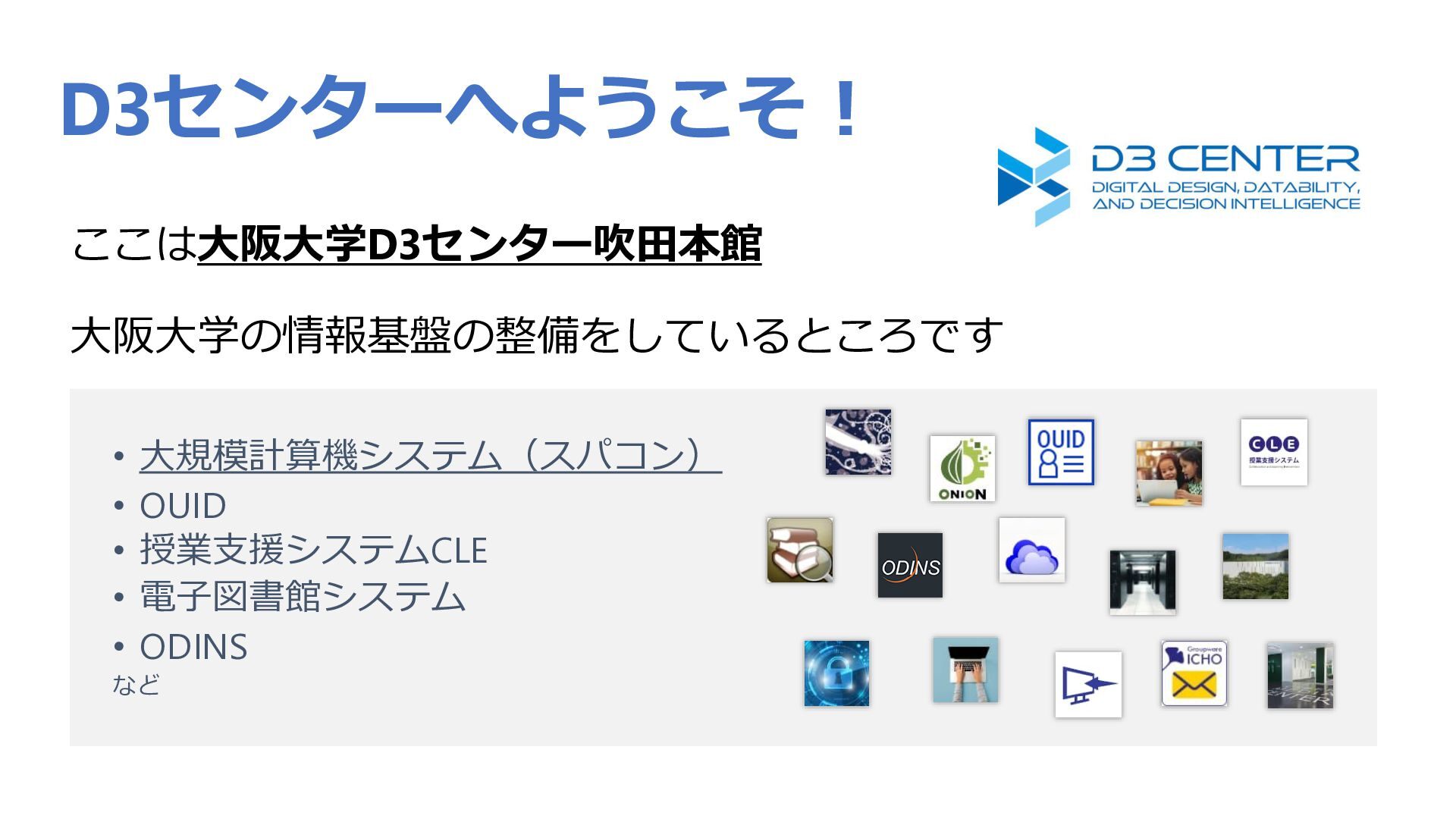 D3センターへようこそ! ここは大阪大学D3センター吹田本館 大阪大学の情報基盤の整備をしているところです • 大規模計算機システム(スパコン) • OUID • 授業支援システムCLE •