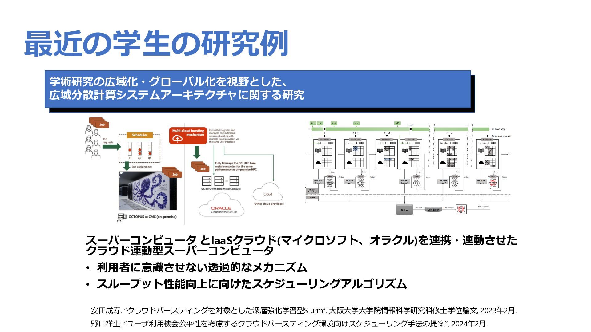 2024年2月. 安田成寿, “クラウドバースティングを対象とした深層強化学習型Slurm”, 大阪大学大学院情報科学研究科修士学位論文, 2023年2月. 学術研究の広域化・グローバル化を視野とした、 広域分散計算システムアーキテクチャに関する研究