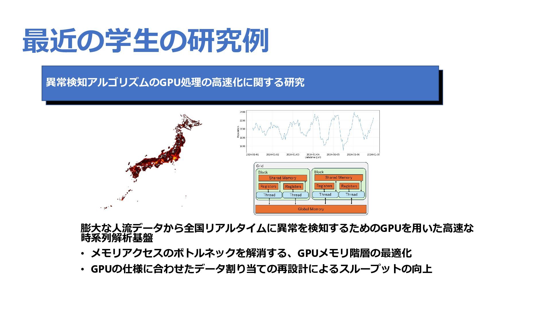 最近の学生の研究例 膨大な人流データから全国リアルタイムに異常を検知するためのGPUを用いた高速な 時系列解析基盤 • メモリアクセスのボトルネックを解消する、GPUメモリ階層の最適化 • GPUの仕様に合わせたデータ割り当ての再設計によるスループットの向上 異常検知アルゴリズムのGPU処理の高速化に関する研究