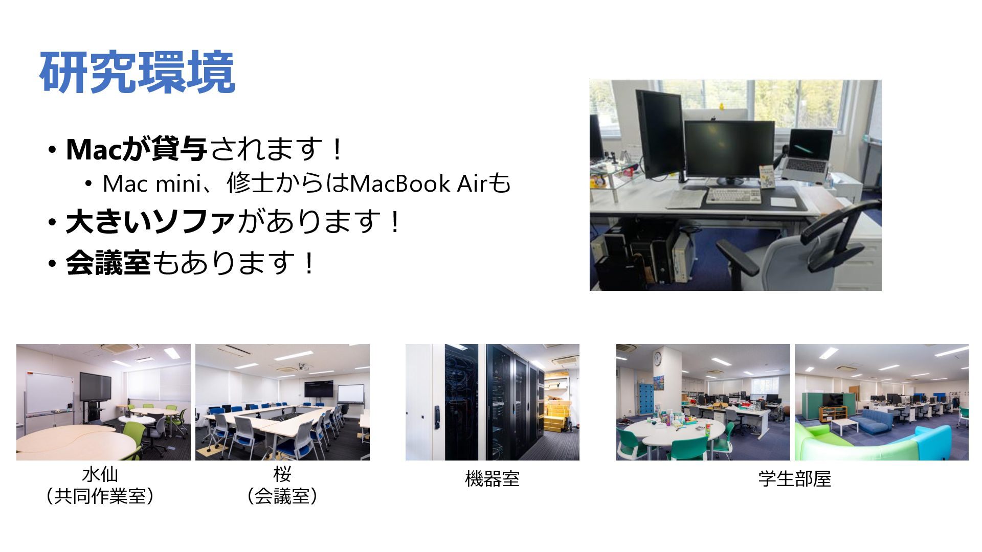 研究環境 • Macが貸与されます! • Mac mini、修士からはMacBook Airも • 大きいソファがあります! •