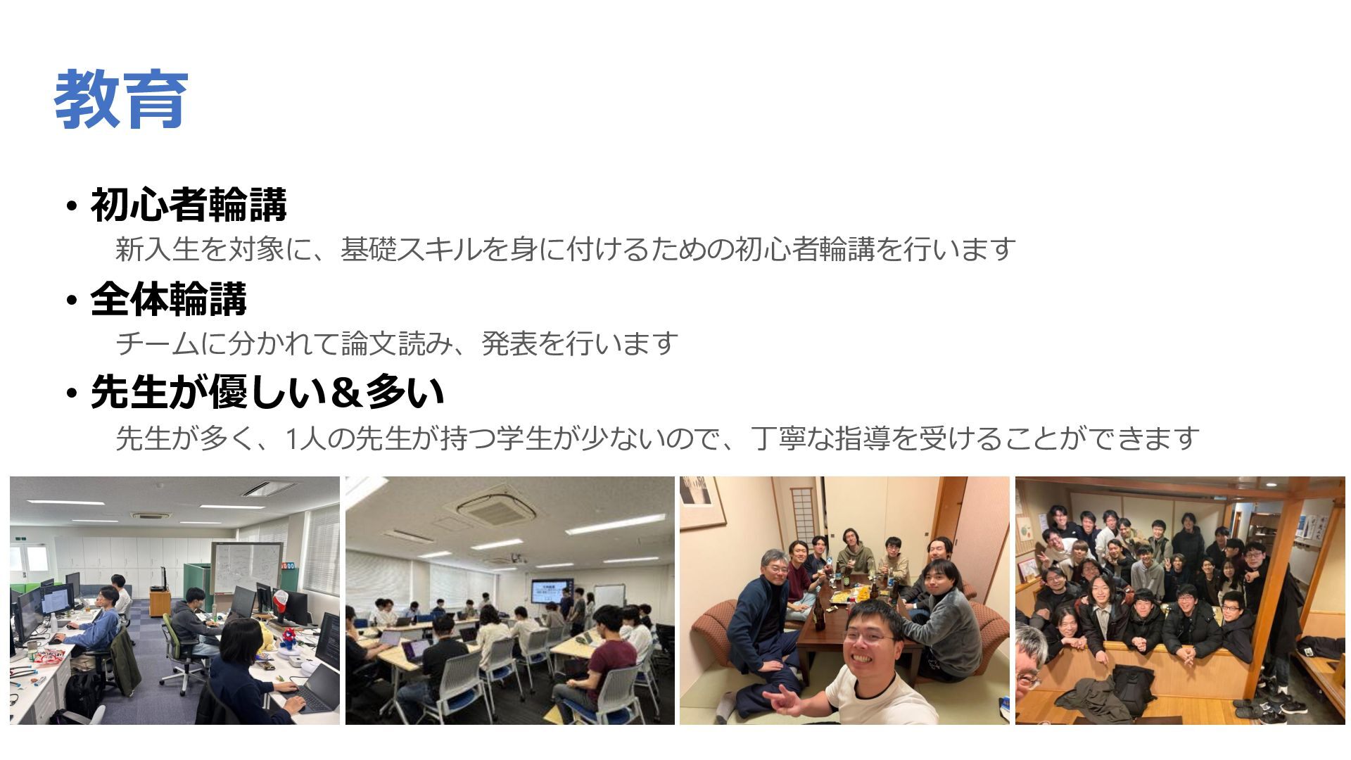 教育 • 初心者輪講 新入生を対象に、基礎スキルを身に付けるための初心者輪講を行います • 全体輪講 チームに分かれて論文読み、発表を行います • 先生が優しい&多い 先生が多く、1人の先生が持つ学生が少ないので、丁寧な指導を受けることができます