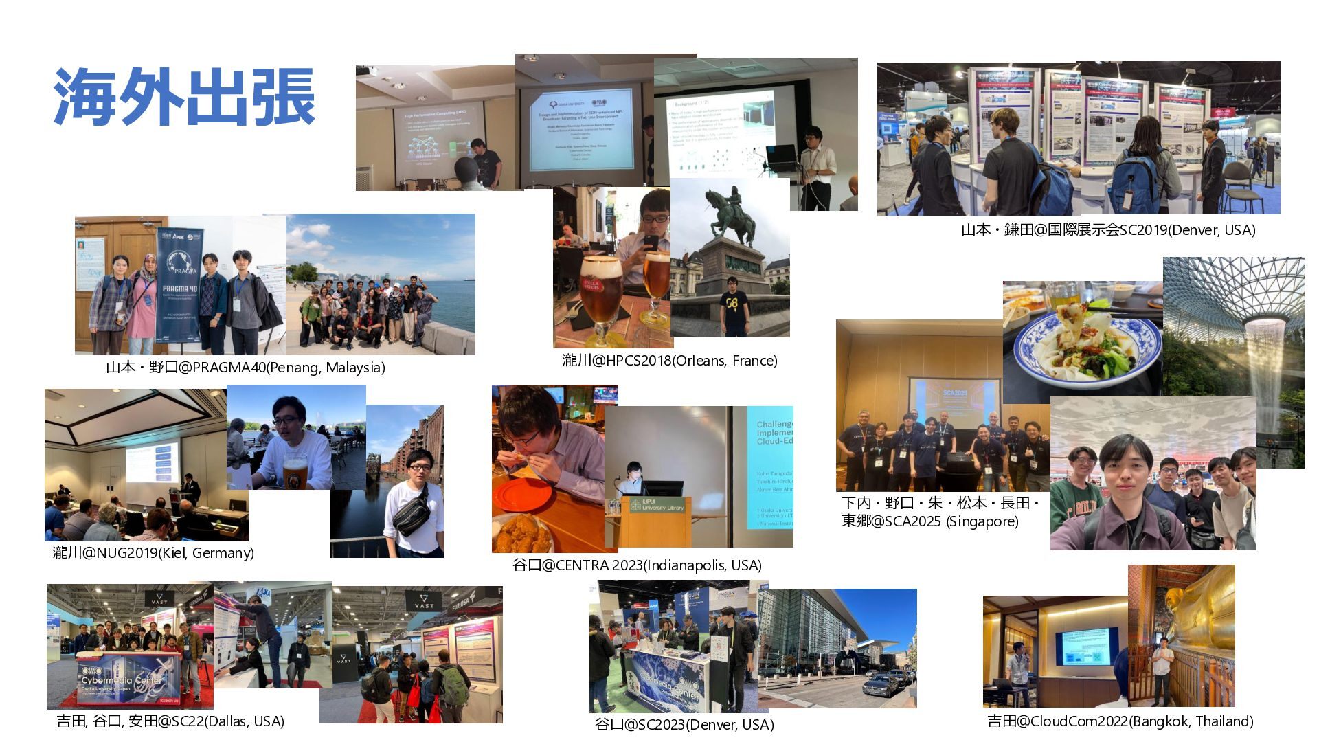 瀧川@HPCS2018(Orleans, France) 吉田, 谷口, 安田@SC22(Dallas, USA) 吉田@CloudCom2022(Bangkok, Thailand) 谷口@CENTRA 2023(Indianapolis, USA) 谷口@SC2023(Denver, USA)