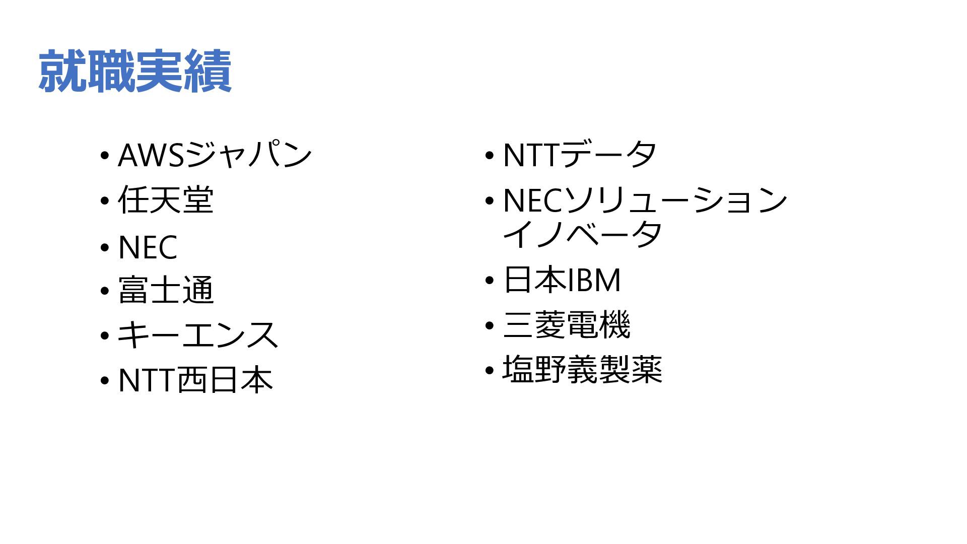 就職実績 • AWSジャパン • 任天堂 • NEC • 富士通 •