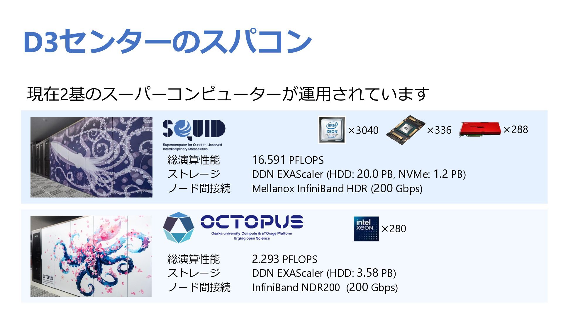 D3センターのスパコン 現在2基のスーパーコンピューターが運用されています 総演算性能 2.293 PFLOPS ストレージ DDN EXAScaler (HDD: 3.58