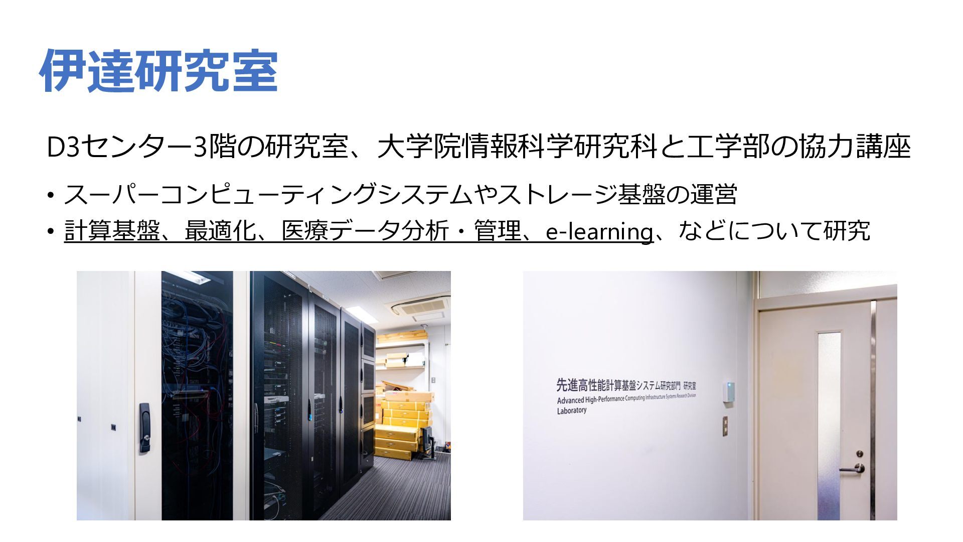 伊達研究室 D3センター3階の研究室、大学院情報科学研究科と工学部の協力講座 • スーパーコンピューティングシステムやストレージ基盤の運営 • 計算基盤、最適化、医療データ分析・管理、e-learning、などについて研究