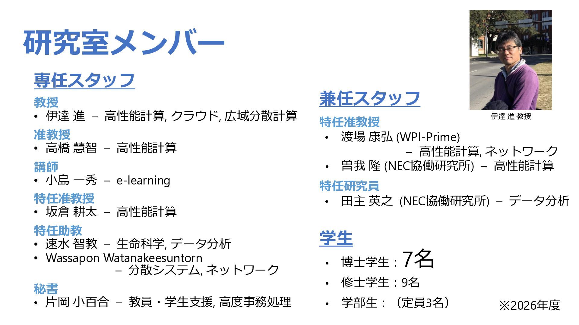准教授 • 高橋 慧智 – 高性能計算 講師 • 小島 一秀 – e-learning 特任准教授 • 坂倉 耕太 – 高性能計算 特任助教 • 速水 智教 – 生命科学, データ分析 • Wassapon Watanakeesuntorn – 分散システム, ネットワーク 秘書 • 片岡 小百合 – 教員・学生支援, 高度事務処理 兼任スタッフ 特任准教授 • 渡場 康弘 (WPI-Prime) – 高性能計算, ネットワーク • 曽我 隆 (NEC協働研究所) – 高性能計算 特任研究員 • 田主 英之 (NEC協働研究所) – データ分析 学生 • 博士学生: • 修士学生:9名 • 学部生:(定員3名) 7名 伊達 進 教授 ※2026年度