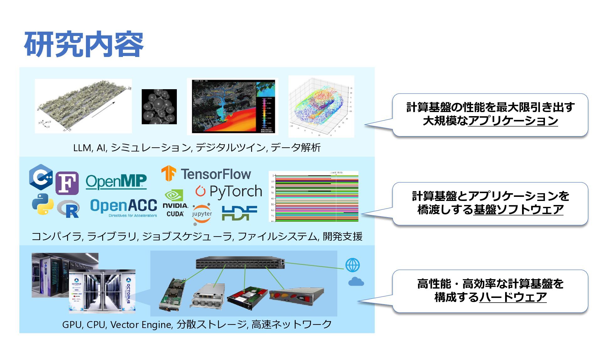 研究内容 GPU, CPU, Vector Engine, 分散ストレージ, 高速ネットワーク コンパイラ, ライブラリ, ジョブスケジューラ,