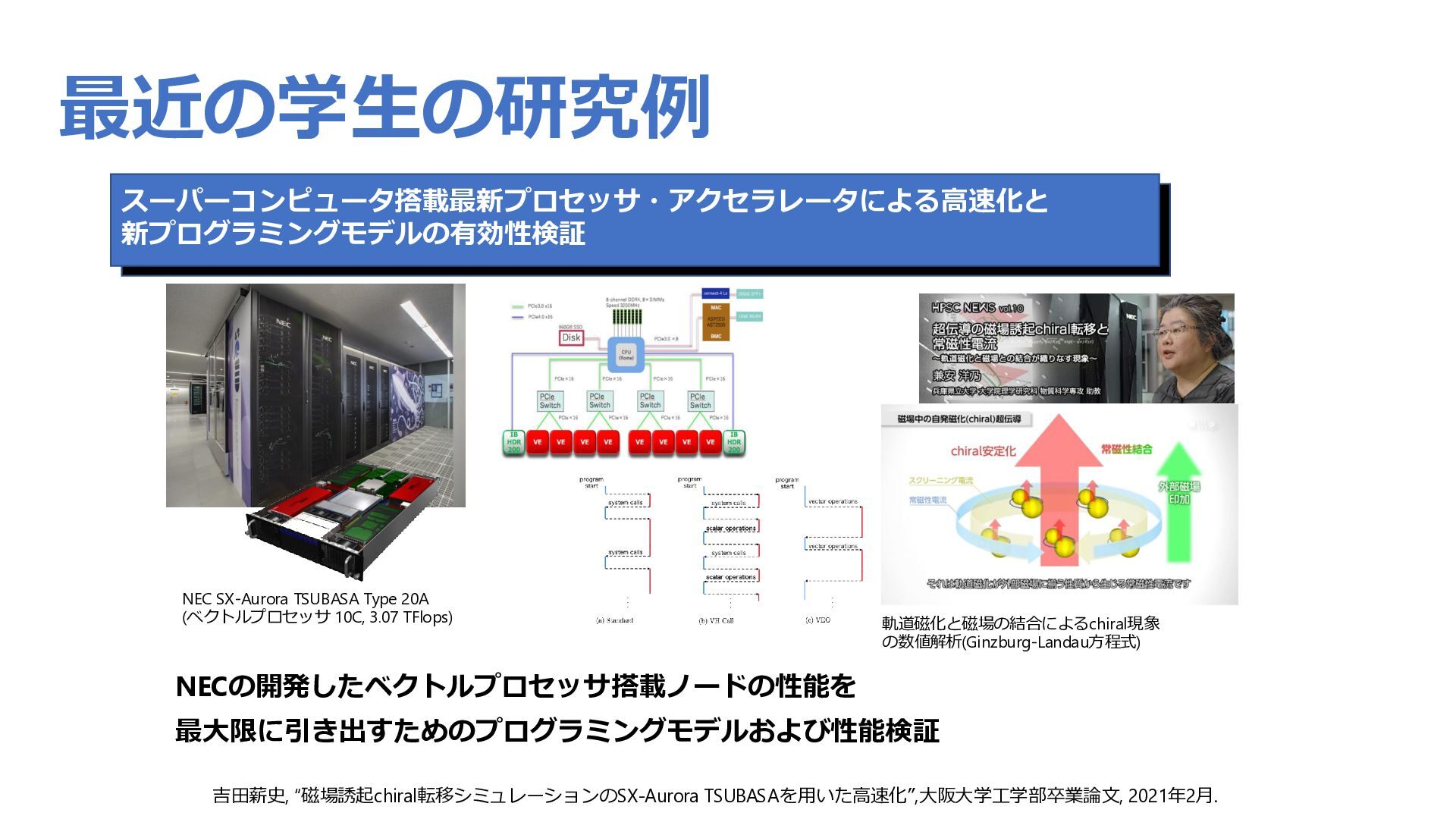3.07 TFlops) 軌道磁化と磁場の結合によるchiral現象 の数値解析(Ginzburg-Landau方程式) スーパーコンピュータ搭載最新プロセッサ・アクセラレータによる高速化と 新プログラミングモデルの有効性検証 吉田薪史, “磁場誘起chiral転移シミュレーションのSX-Aurora TSUBASAを用いた高速化”,大阪大学工学部卒業論文, 2021年2月.