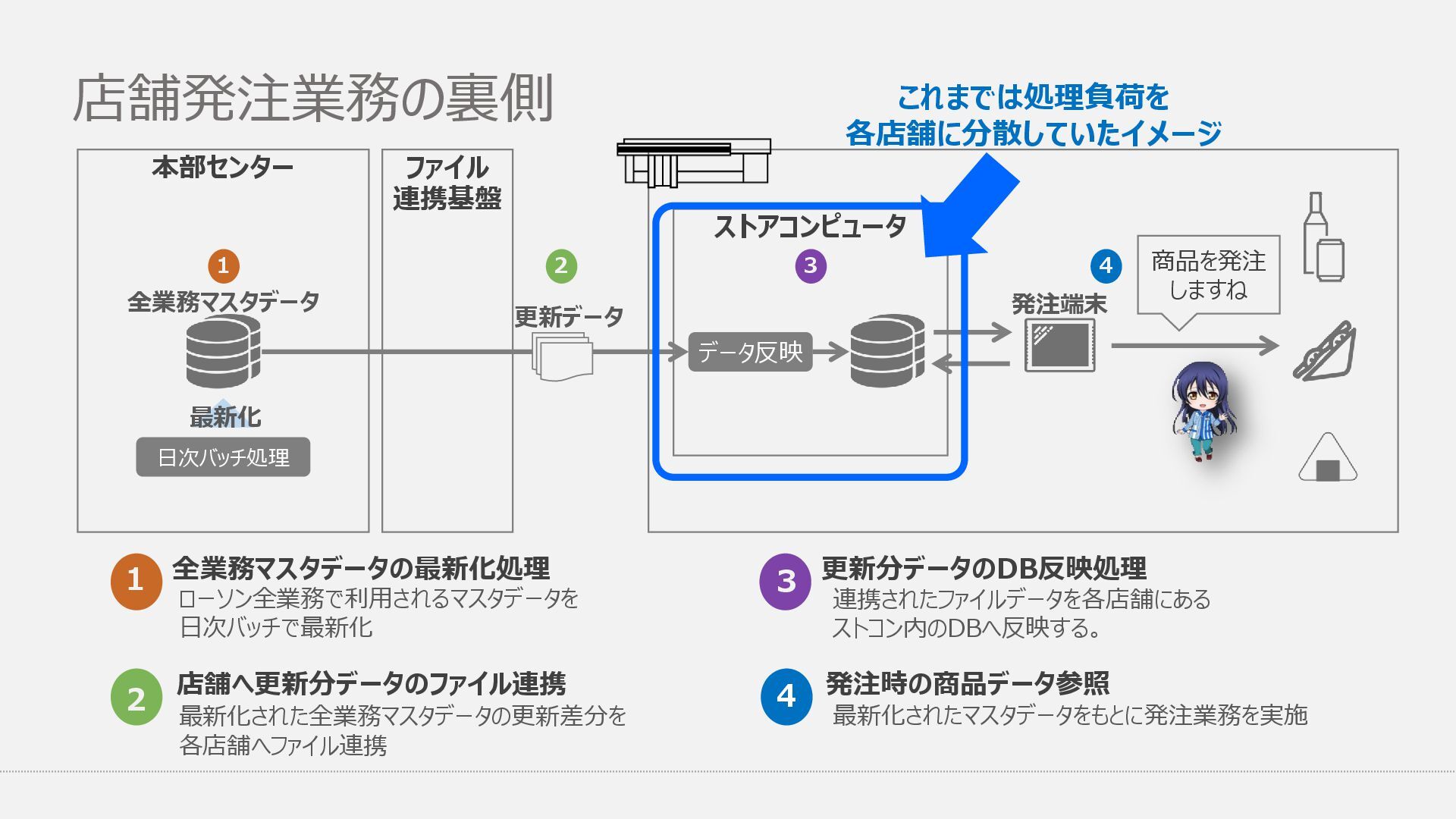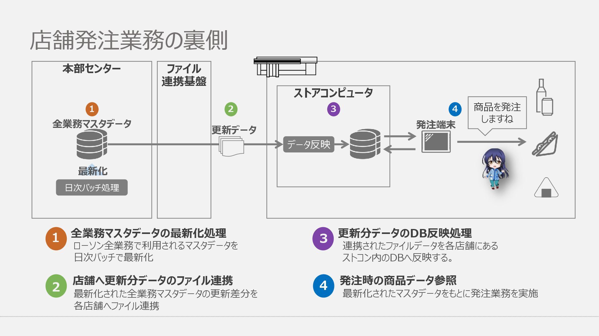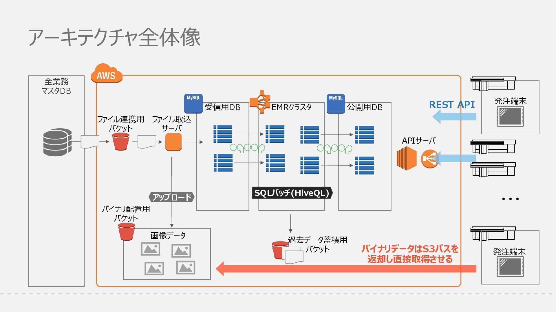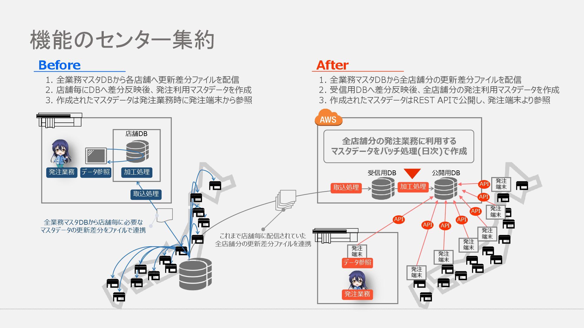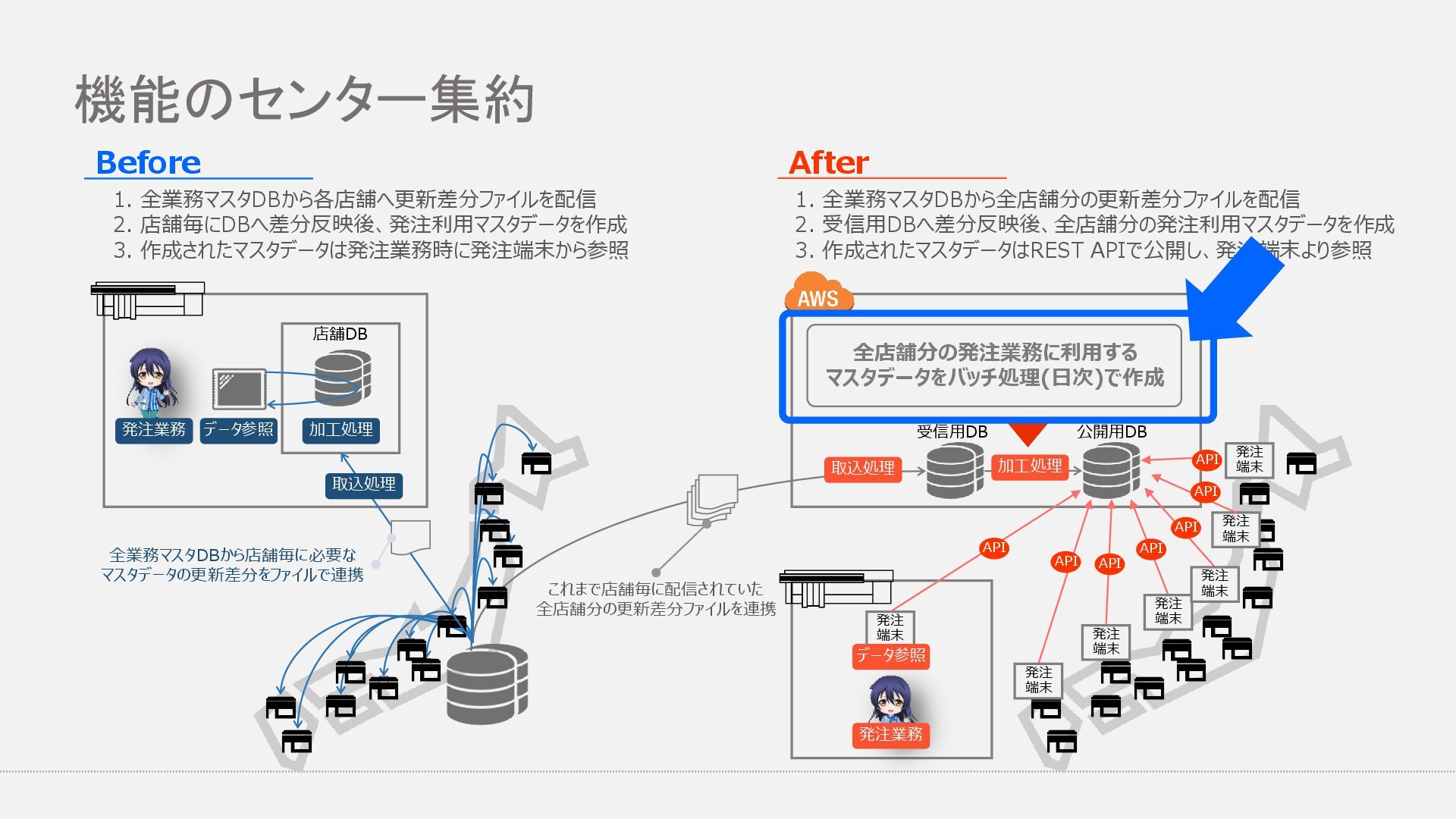 発注 端末 発注 端末 発注 端末 発注 端末 発注 端末 発注 端末 API API API API API API API 全店舗分の発注業務に利用する マスタデータをバッチ処理(日次)で作成 全業務マスタDBから店舗毎に必要な マスタデータの更新差分をファイルで連携 これまで店舗毎に配信されていた 全店舗分の更新差分ファイルを連携 受信用DB 公開用DB 1. 全業務マスタDBから各店舗へ更新差分ファイルを配信 2. 店舗毎にDBへ差分反映後、発注利用マスタデータを作成 3. 作成されたマスタデータは発注業務時に発注端末から参照 1. 全業務マスタDBから全店舗分の更新差分ファイルを配信 2. 受信用DBへ差分反映後、全店舗分の発注利用マスタデータを作成 3. 作成されたマスタデータはREST APIで公開し、発注端末より参照 データ参照 発注業務 Before After