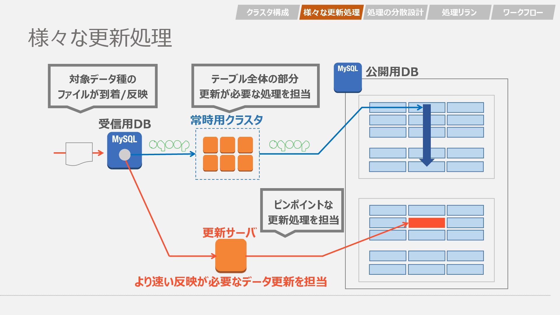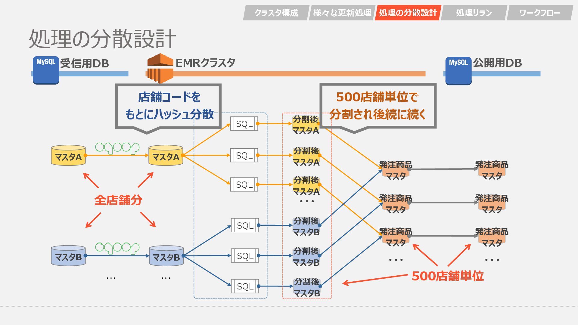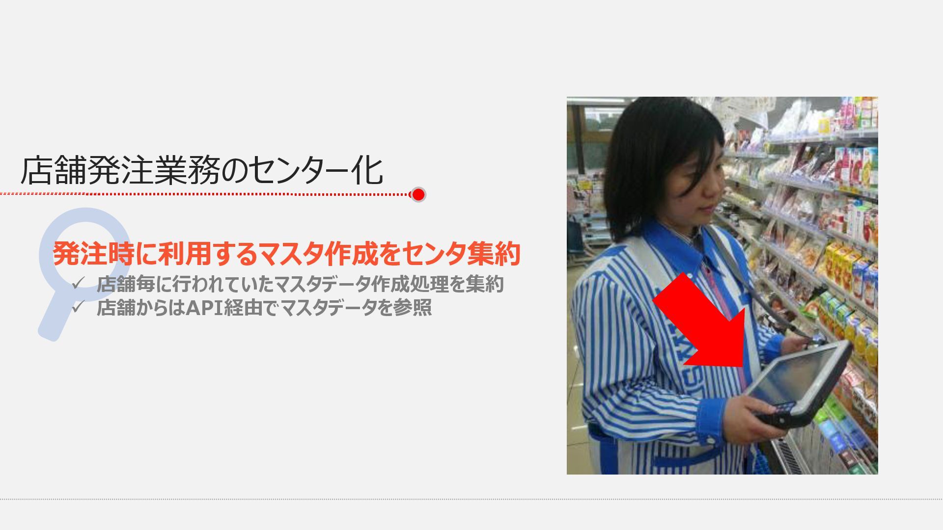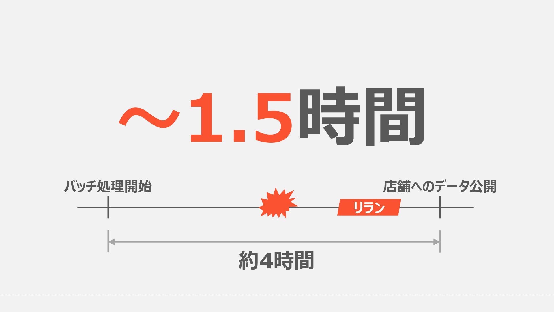 発注 端末 発注 端末 発注 端末 発注 端末 発注 端末 発注 端末 API API API API API API API 全店舗分の発注業務に利用する マスタデータをバッチ処理(日次)で作成 全業務マスタDBから店舗毎に必要な マスタデータの更新差分をファイルで連携 これまで店舗毎に配信されていた 全店舗分の更新差分ファイルを連携 受信用DB 公開用DB 1. 全業務マスタDBから各店舗へ更新差分ファイルを配信 2. 店舗毎にDBへ差分反映後、発注利用マスタデータを作成 3. 作成されたマスタデータは発注業務時に発注端末から参照 1. 全業務マスタDBから全店舗分の更新差分ファイルを配信 2. 受信用DBへ差分反映後、全店舗分の発注利用マスタデータを作成 3. 作成されたマスタデータはREST APIで公開し、発注端末より参照 データ参照 発注業務 Before After