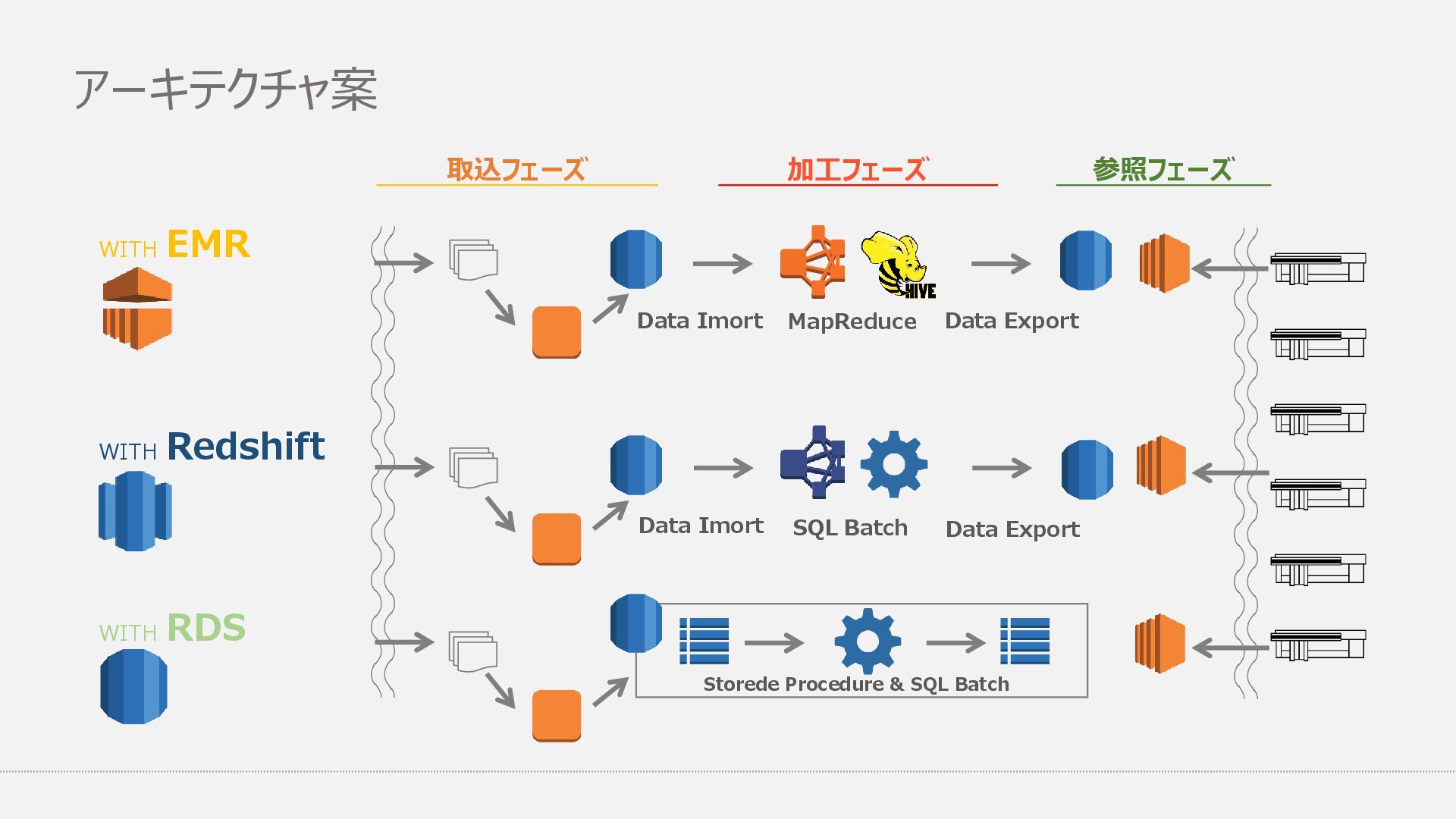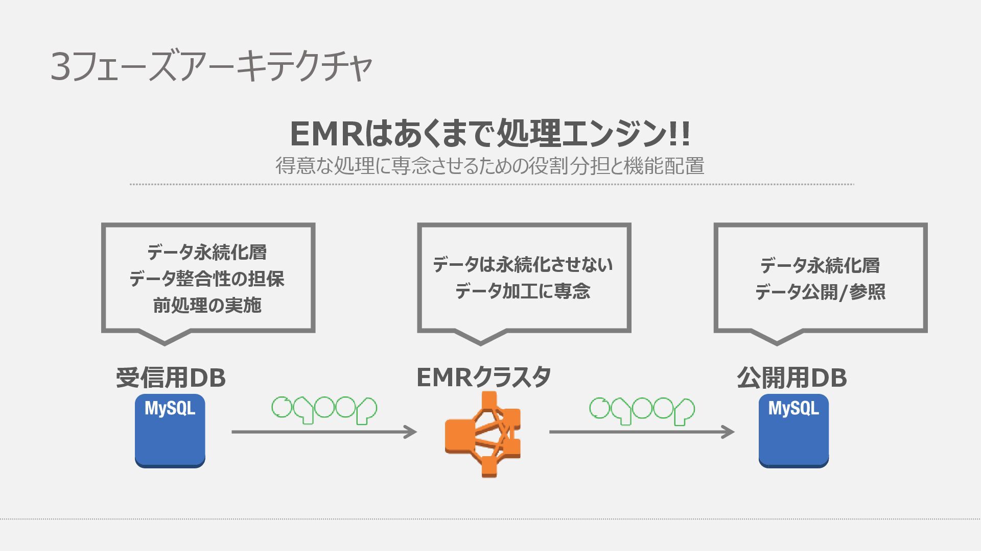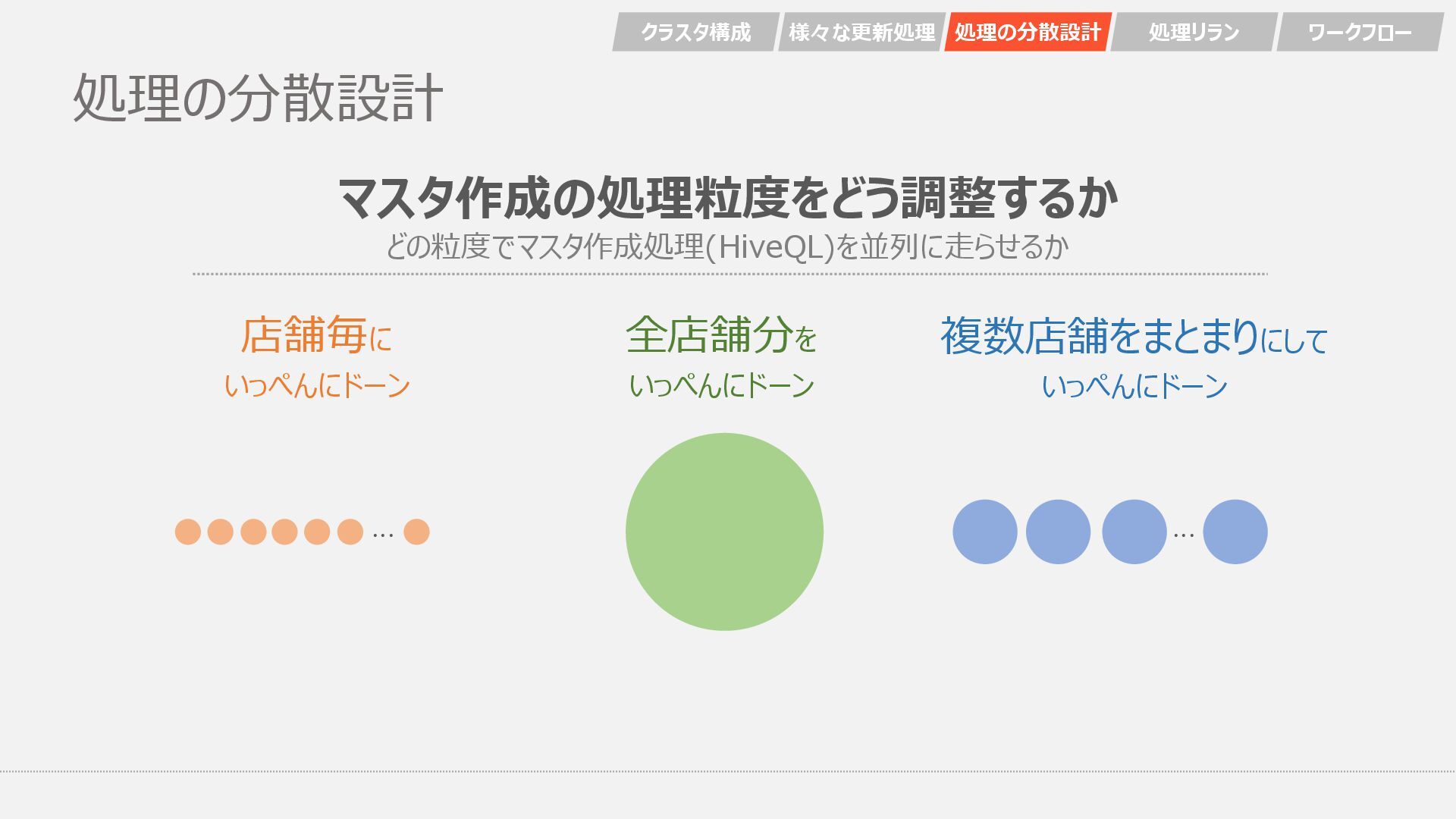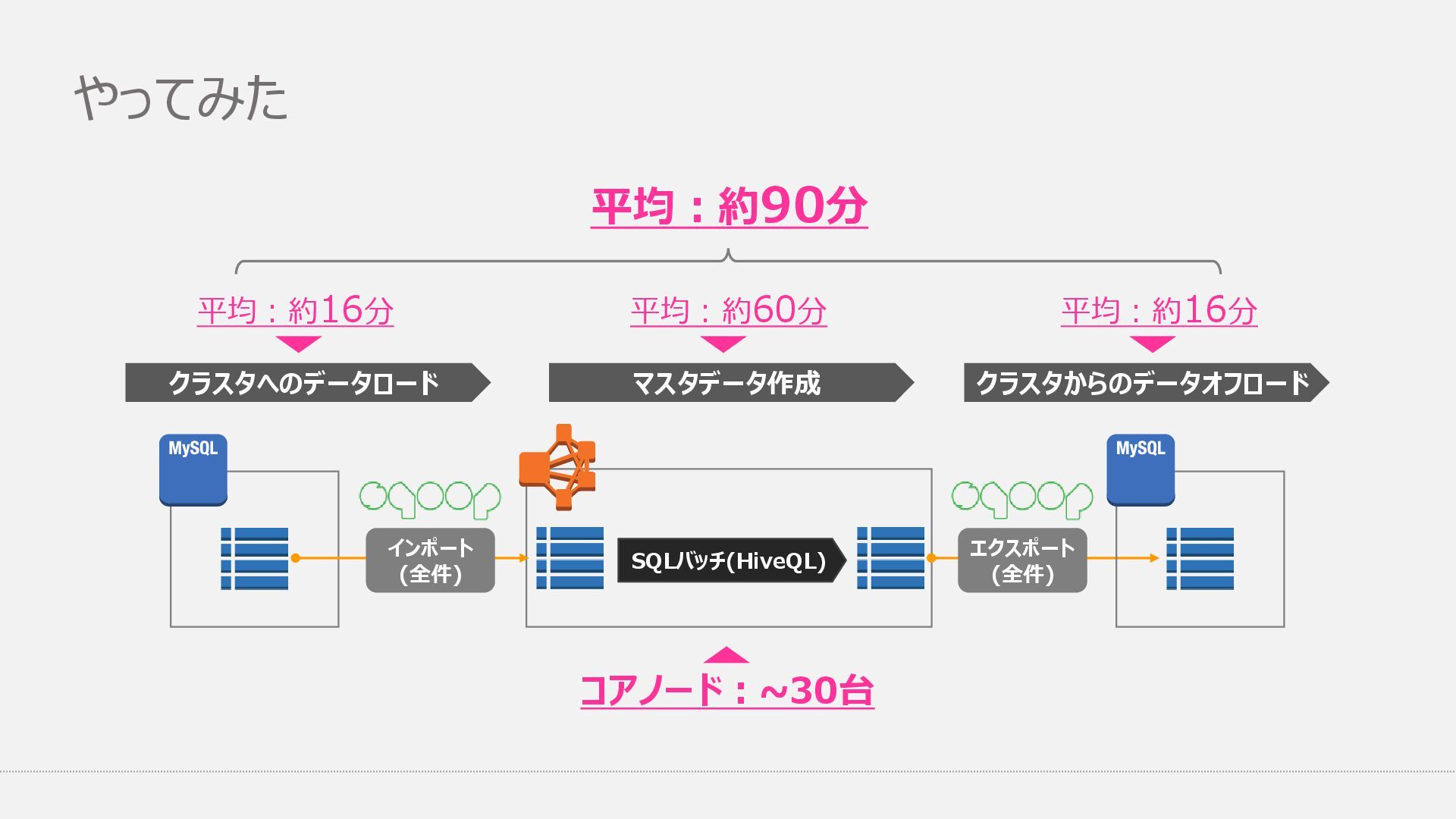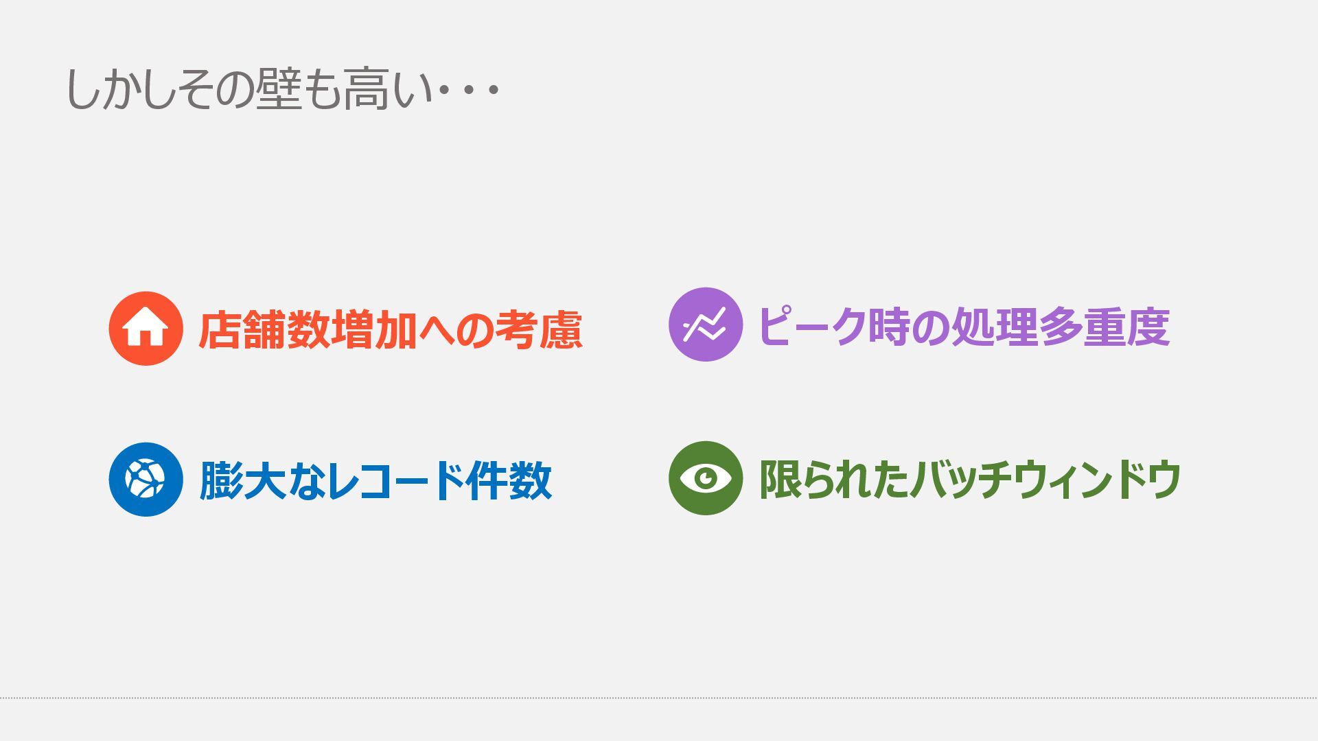 発注 端末 発注 端末 発注 端末 発注 端末 発注 端末 発注 端末 API API API API API API API 全店舗分の発注業務に利用する マスタデータをバッチ処理(日次)で作成 全業務マスタDBから店舗毎に必要な マスタデータの更新差分をファイルで連携 これまで店舗毎に配信されていた 全店舗分の更新差分ファイルを連携 受信用DB 公開用DB 1. 全業務マスタDBから各店舗へ更新差分ファイルを配信 2. 店舗毎にDBへ差分反映後、発注利用マスタデータを作成 3. 作成されたマスタデータは発注業務時に発注端末から参照 1. 全業務マスタDBから全店舗分の更新差分ファイルを配信 2. 受信用DBへ差分反映後、全店舗分の発注利用マスタデータを作成 3. 作成されたマスタデータはREST APIで公開し、発注端末より参照 データ参照 発注業務 Before After