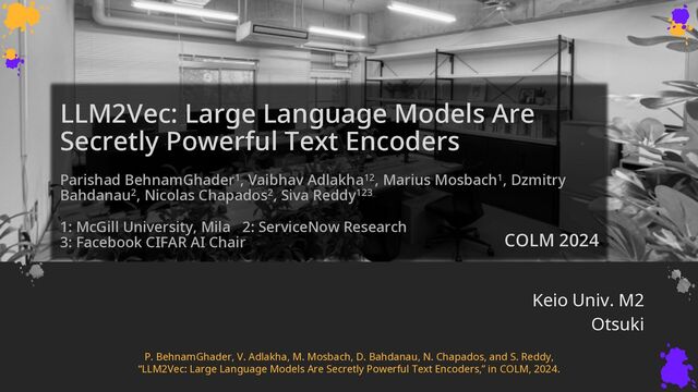 BehnamGhader1, Vaibhav Adlakha12, Marius Mosbach1, Dzmitry Bahdanau2, Nicolas Chapados2, Siva Reddy123 1: McGill University, Mila 2: ServiceNow Research 3: Facebook CIFAR AI Chair Keio Univ. M2 Otsuki P. BehnamGhader, V. Adlakha, M. Mosbach, D. Bahdanau, N. Chapados, and S. Reddy, “LLM2Vec: Large Language Models Are Secretly Powerful Text Encoders,” in COLM, 2024. COLM 2024