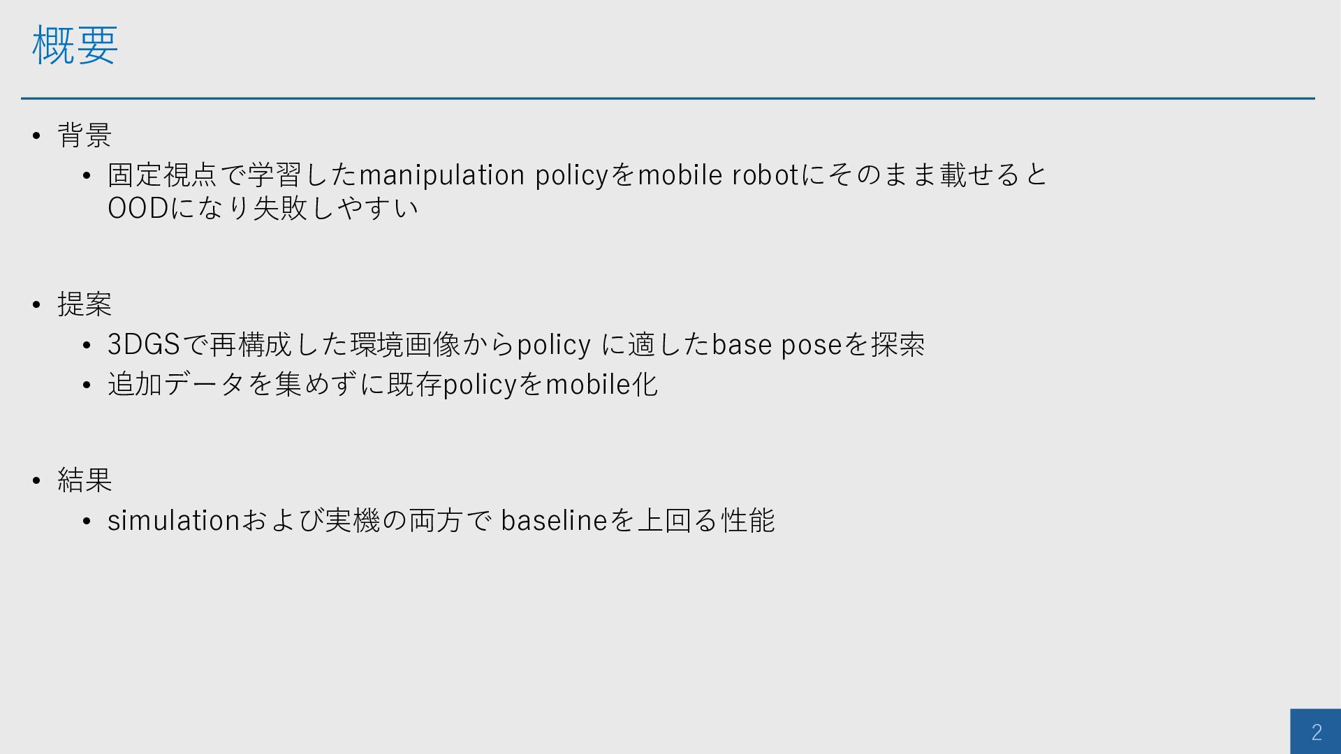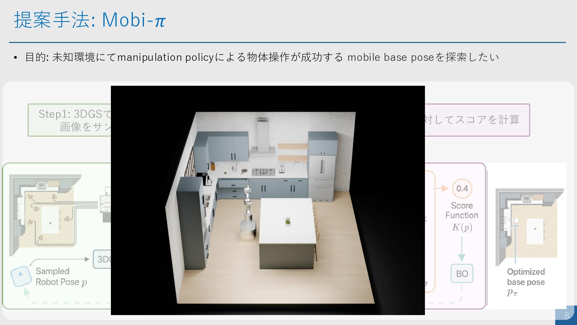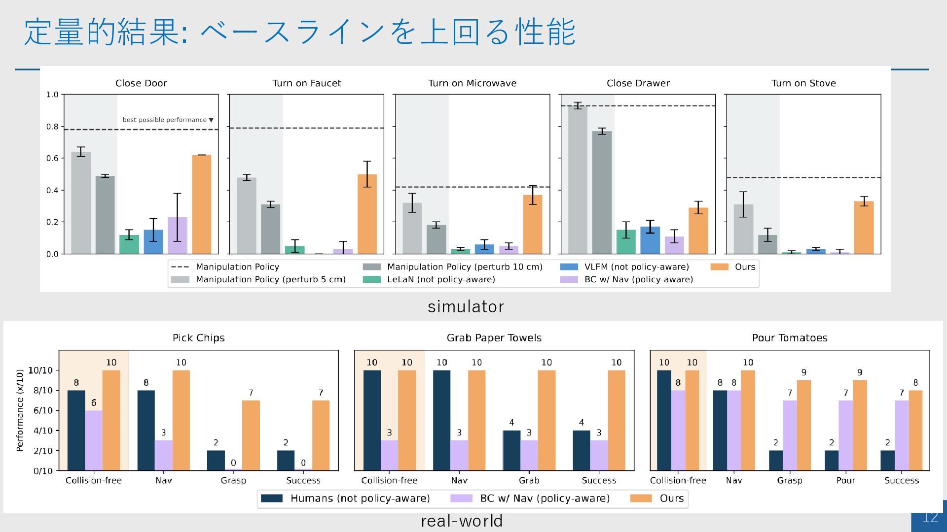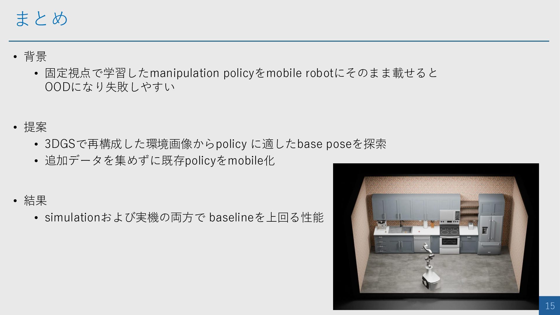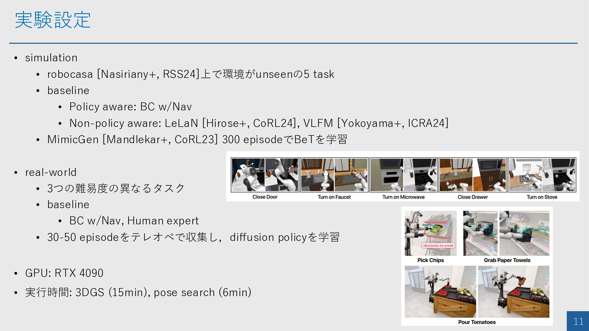 baseline • Policy aware: BC w/Nav • Non-policy aware: LeLaN [Hirose+, CoRL24], VLFM [Yokoyama+, ICRA24] • MimicGen [Mandlekar+, CoRL23] 300 episodeでBeTを学習 • real-world • 3つの難易度の異なるタスク • baseline • BC w/Nav, Human expert • 30-50 episodeをテレオペで収集し,diffusion policyを学習 • GPU: RTX 4090 • 実行時間: 3DGS (15min), pose search (6min)