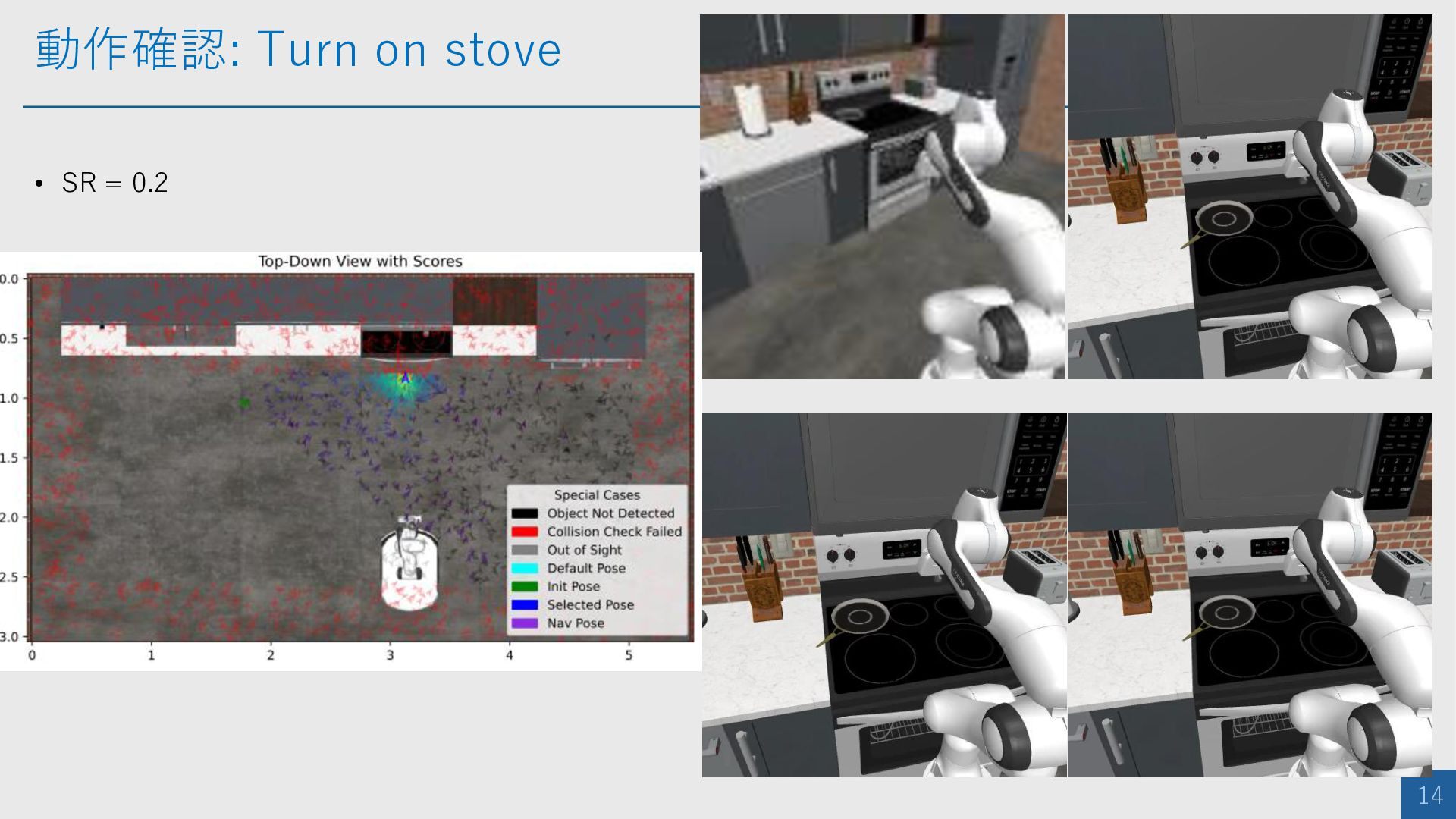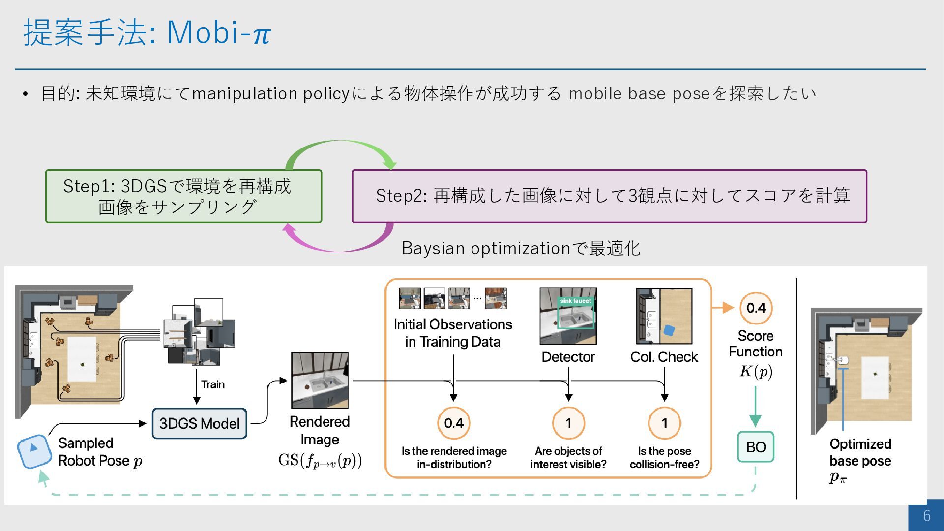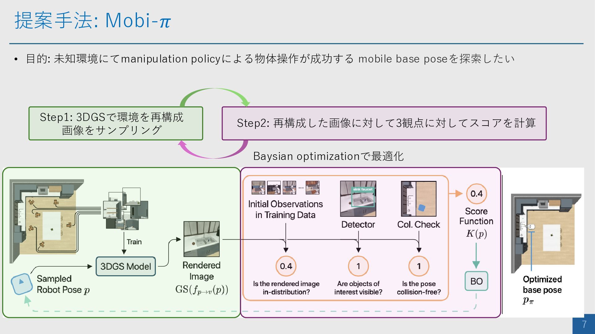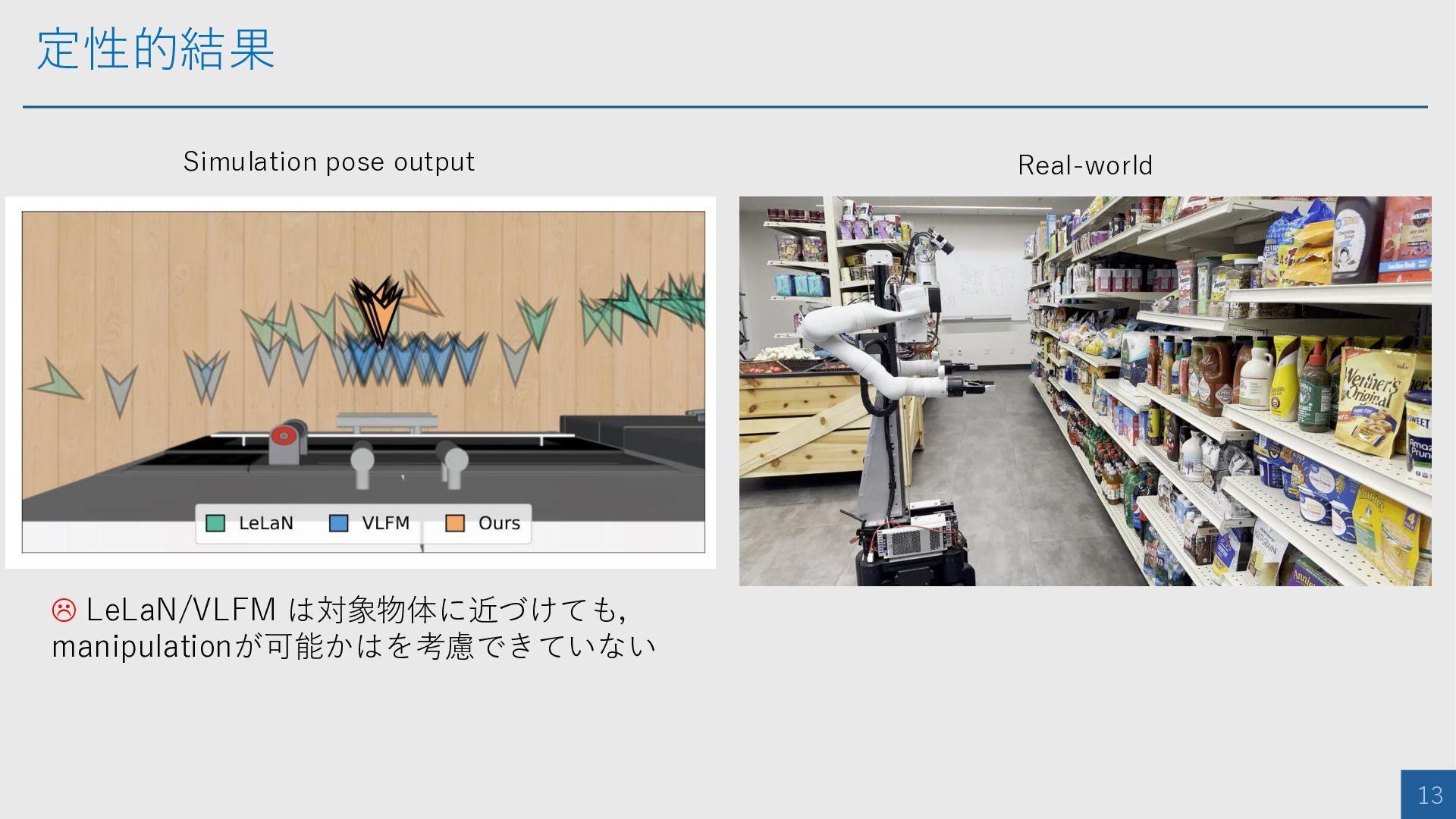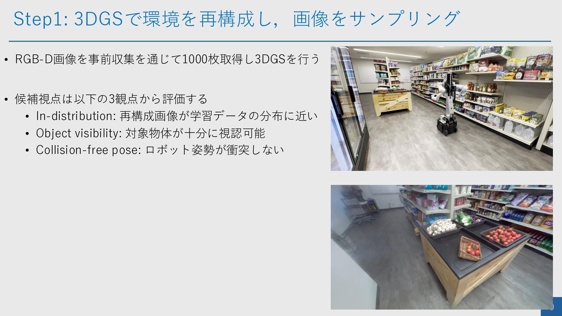 baseline • Policy aware: BC w/Nav • Non-policy aware: LeLaN [Hirose+, CoRL24], VLFM [Yokoyama+, ICRA24] • MimicGen [Mandlekar+, CoRL23] 300 episodeでBeTを学習 • real-world • 3つの難易度の異なるタスク • baseline • BC w/Nav, Human expert • 30-50 episodeをテレオペで収集し,diffusion policyを学習 • GPU: RTX 4090 • 実行時間: 3DGS (15min), pose search (6min)