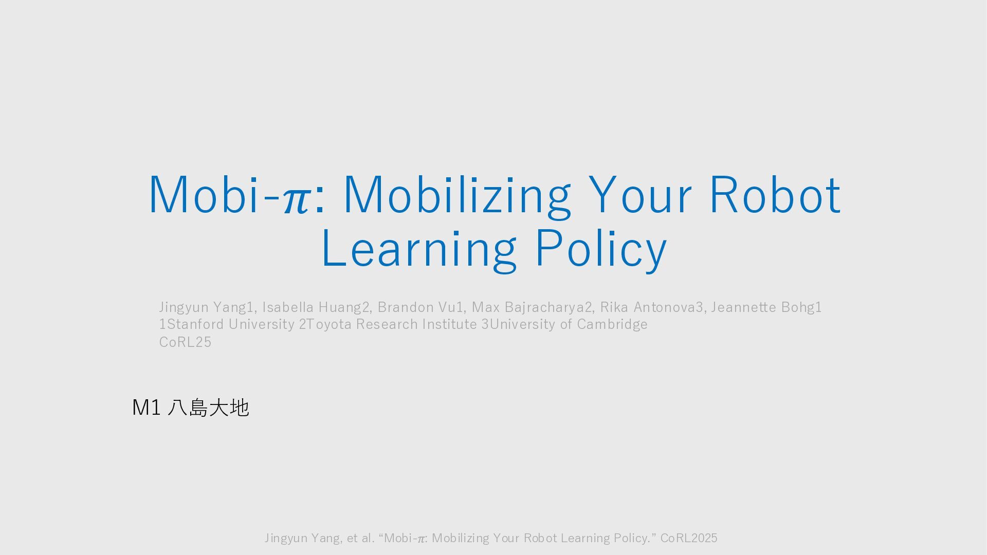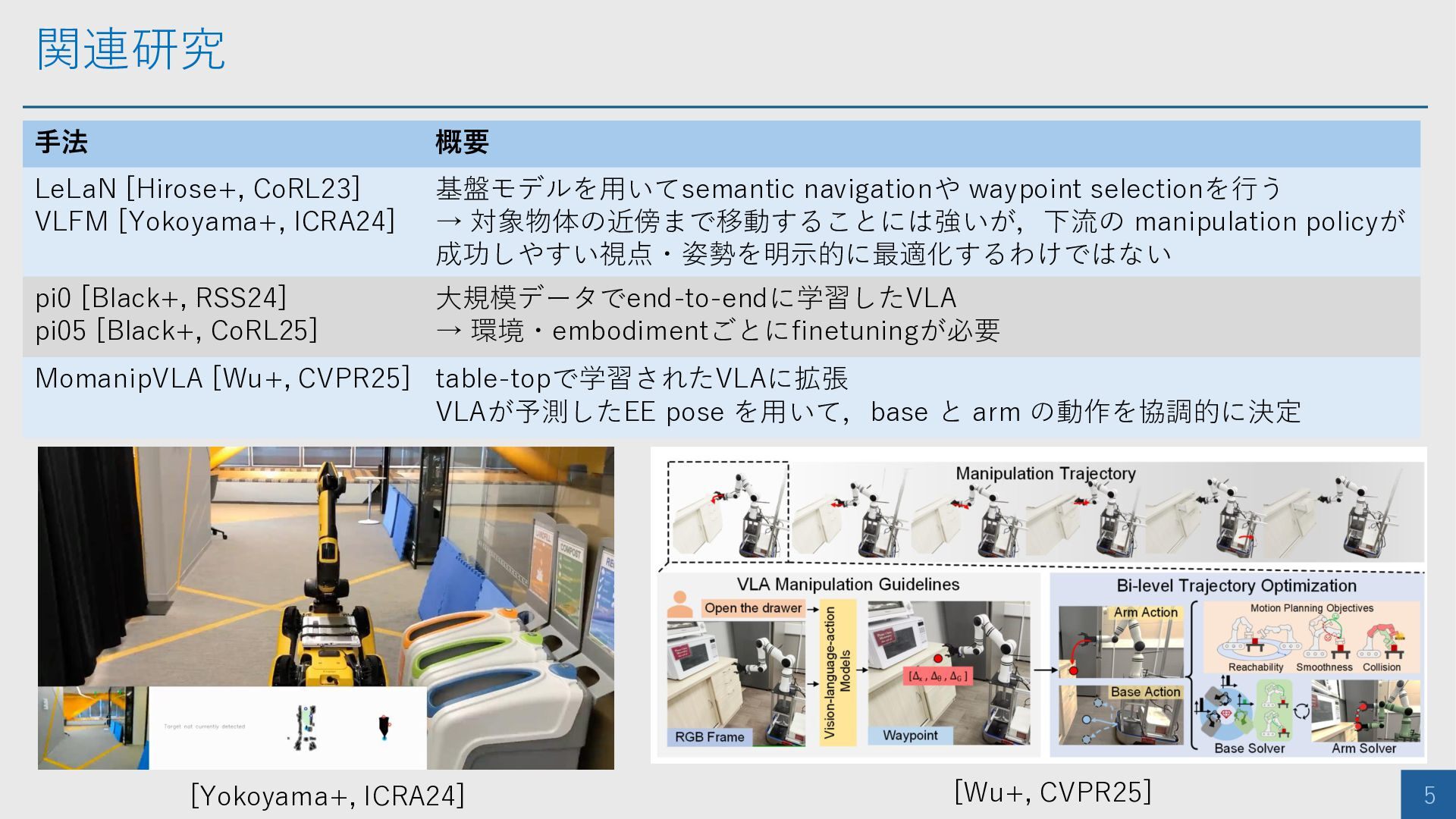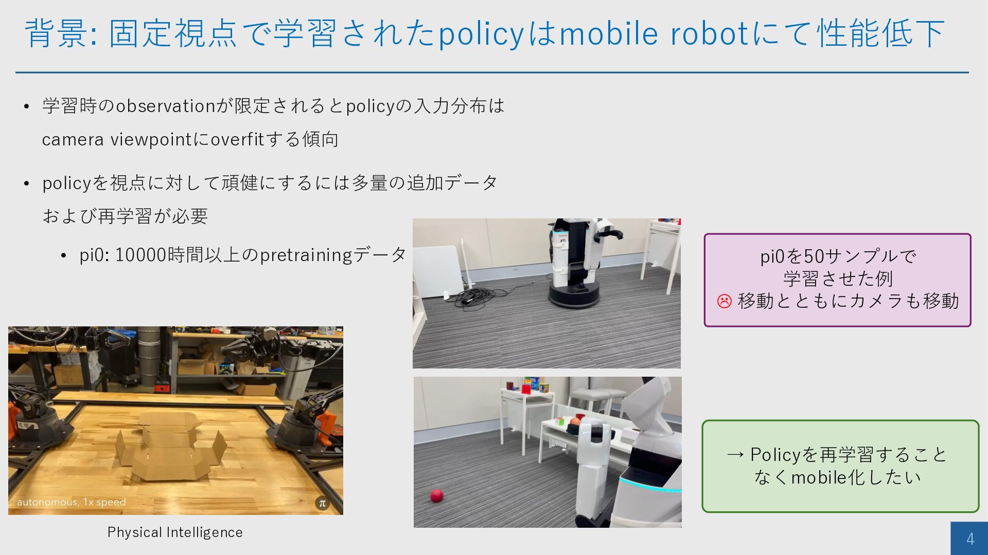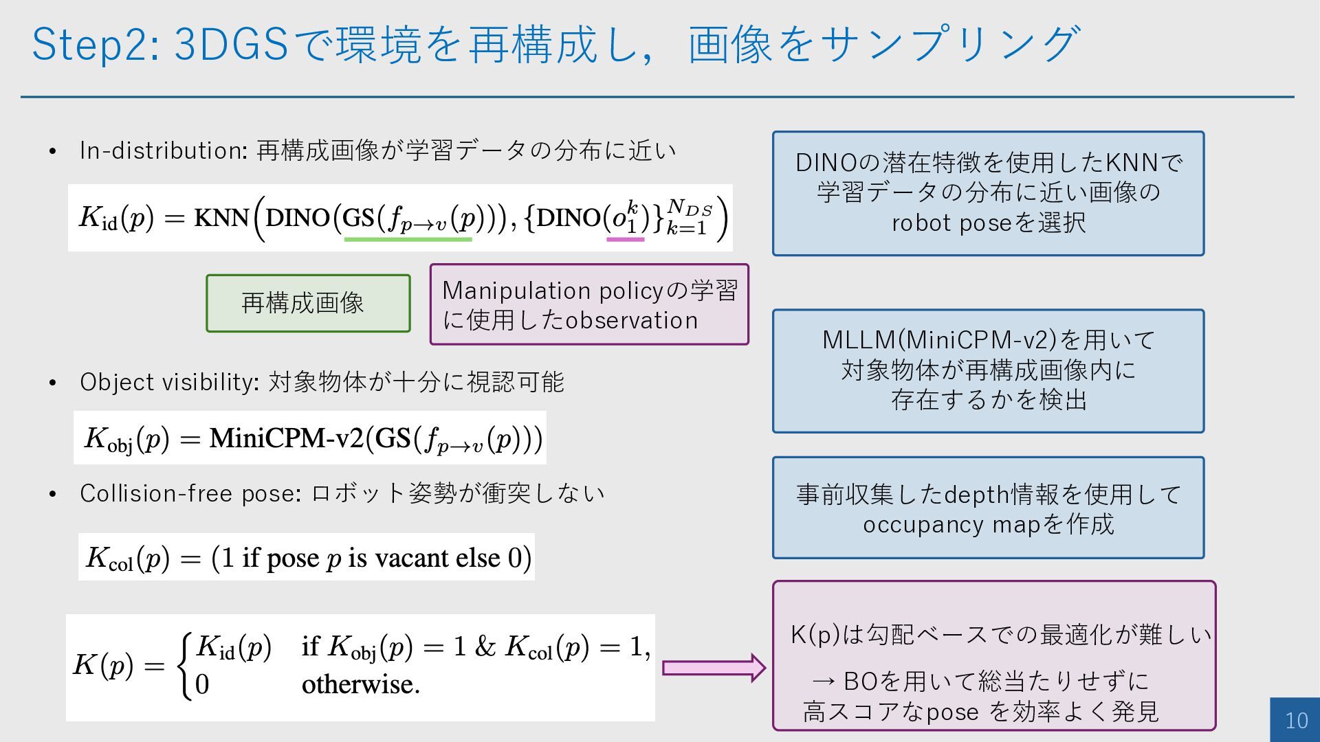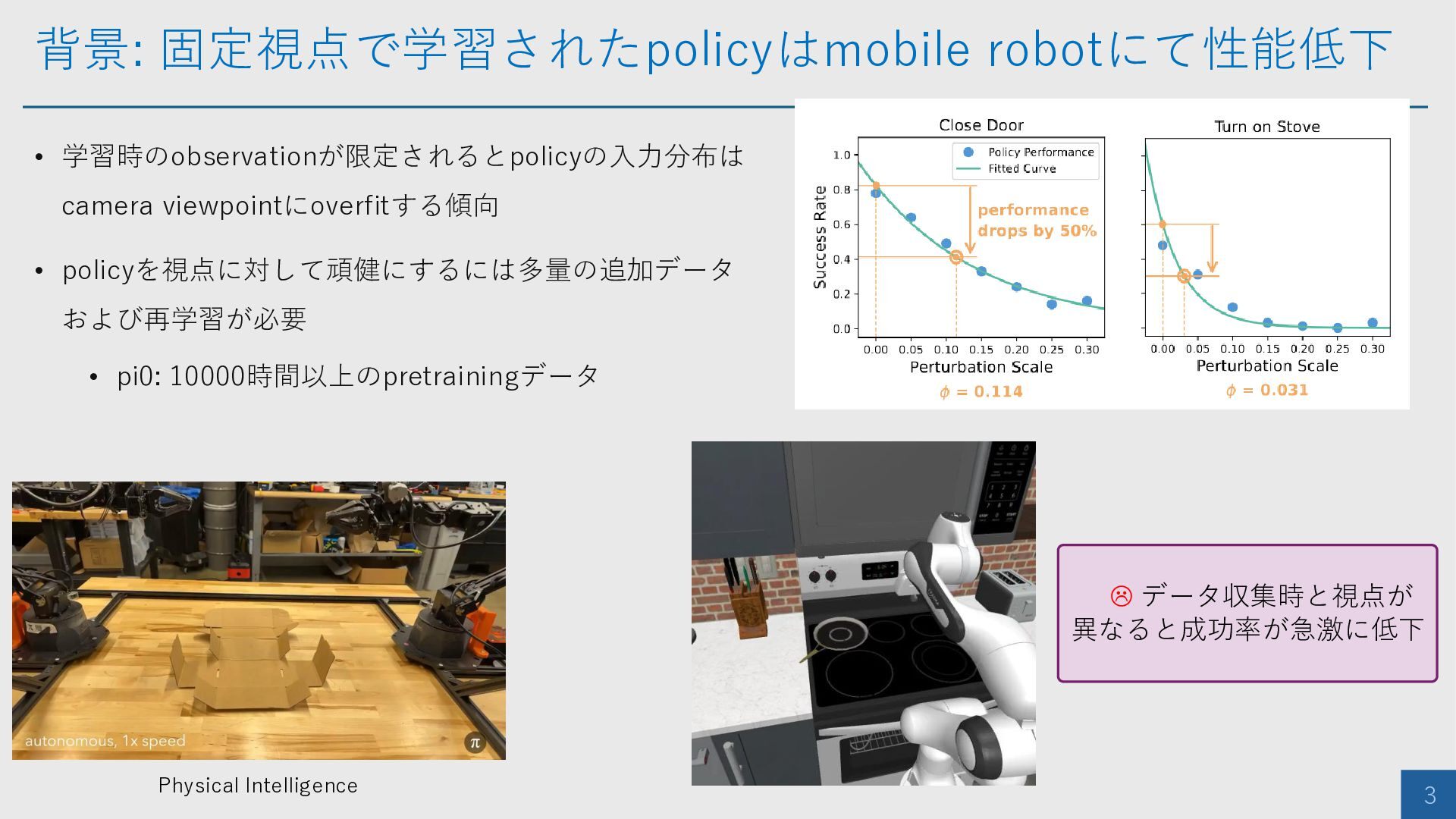 baseline • Policy aware: BC w/Nav • Non-policy aware: LeLaN [Hirose+, CoRL24], VLFM [Yokoyama+, ICRA24] • MimicGen [Mandlekar+, CoRL23] 300 episodeでBeTを学習 • real-world • 3つの難易度の異なるタスク • baseline • BC w/Nav, Human expert • 30-50 episodeをテレオペで収集し,diffusion policyを学習 • GPU: RTX 4090 • 実行時間: 3DGS (15min), pose search (6min)