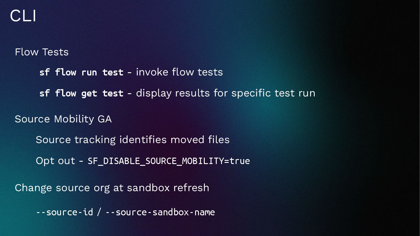 - invoke flow tests sf flow get test - display results for specific test run Source tracking identifies moved files Opt out - SF_DISABLE_SOURCE_MOBILITY=true Change source org at sandbox refresh --source-id / --source-sandbox-name