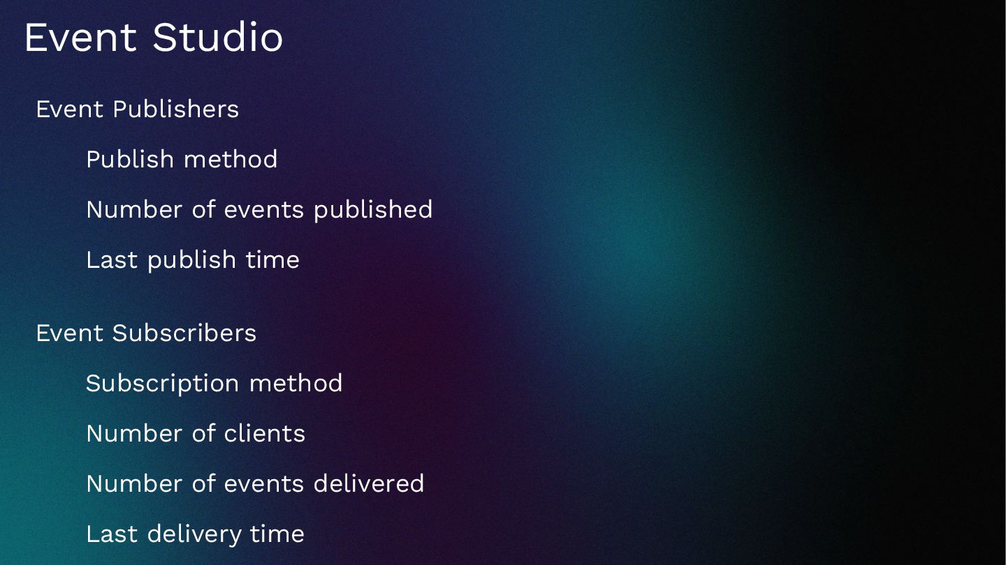 Last publish time Event Subscribers Subscription method Number of clients Number of events delivered Last delivery time
