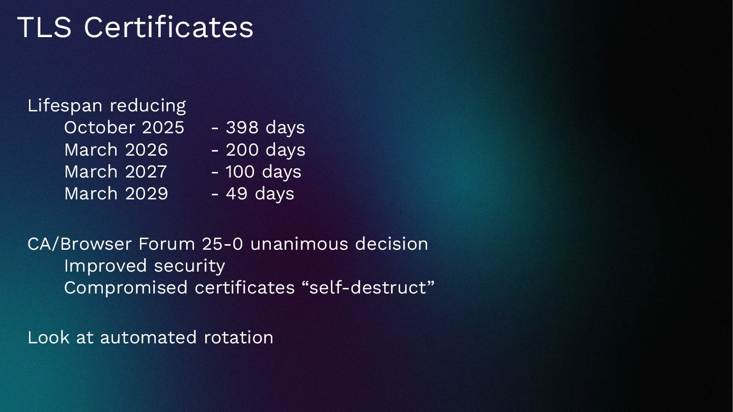 certificates “self-destruct” Lifespan reducing October 2025 - 398 days March 2026 - 200 days March 2027 - 100 days March 2029 - 49 days Look at automated rotation
