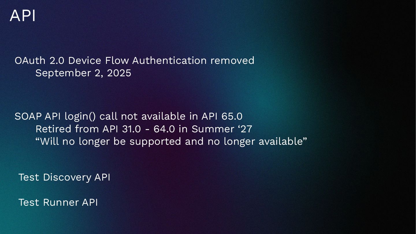 Flow Authentication removed September 2, 2025 SOAP API login() call not available in API 65.0 Retired from API 31.0 - 64.0 in Summer ‘27 “Will no longer be supported and no longer available”