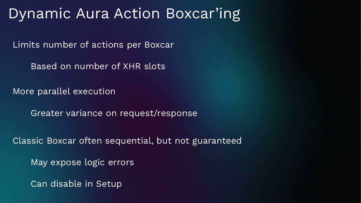 Based on number of XHR slots More parallel execution Greater variance on request/response Classic Boxcar often sequential, but not guaranteed May expose logic errors Can disable in Setup