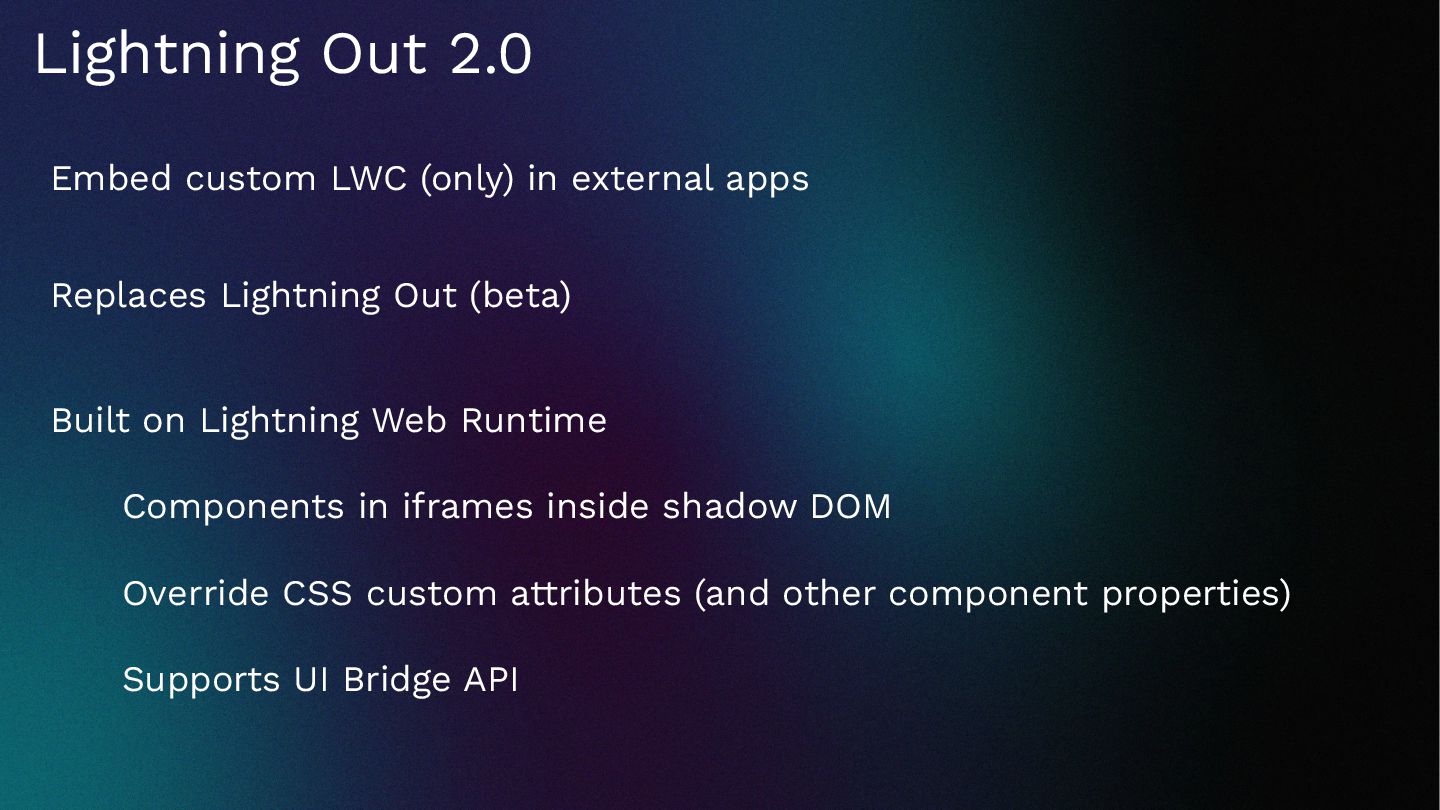 Replaces Lightning Out (beta) Built on Lightning Web Runtime Components in iframes inside shadow DOM Override CSS custom attributes (and other component properties) Supports UI Bridge API