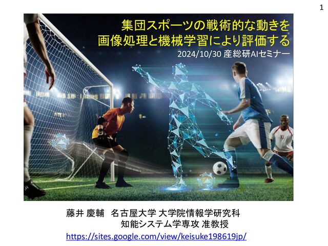 集団スポーツの戦術的な動きを 画像処理と機械学習により評価する 2024/10/30 産総研AIセミナー 1 https://sites.google.com/view/keisuke198619jp/ 藤井 慶輔 名古屋大学 大学院情報学研究科