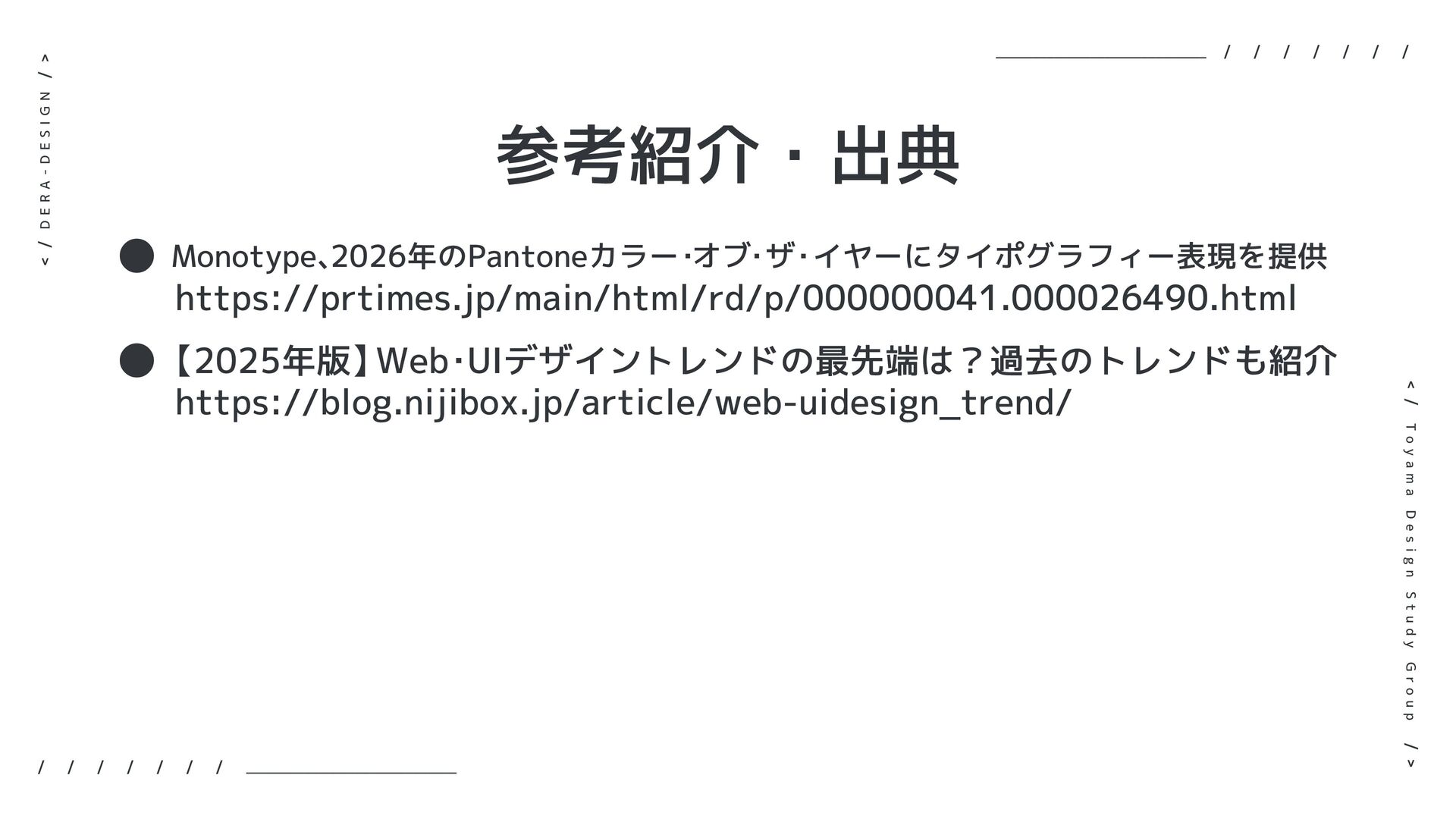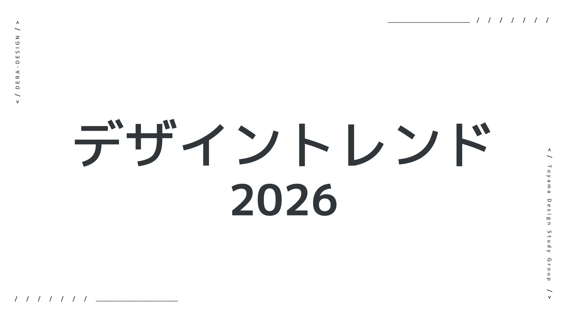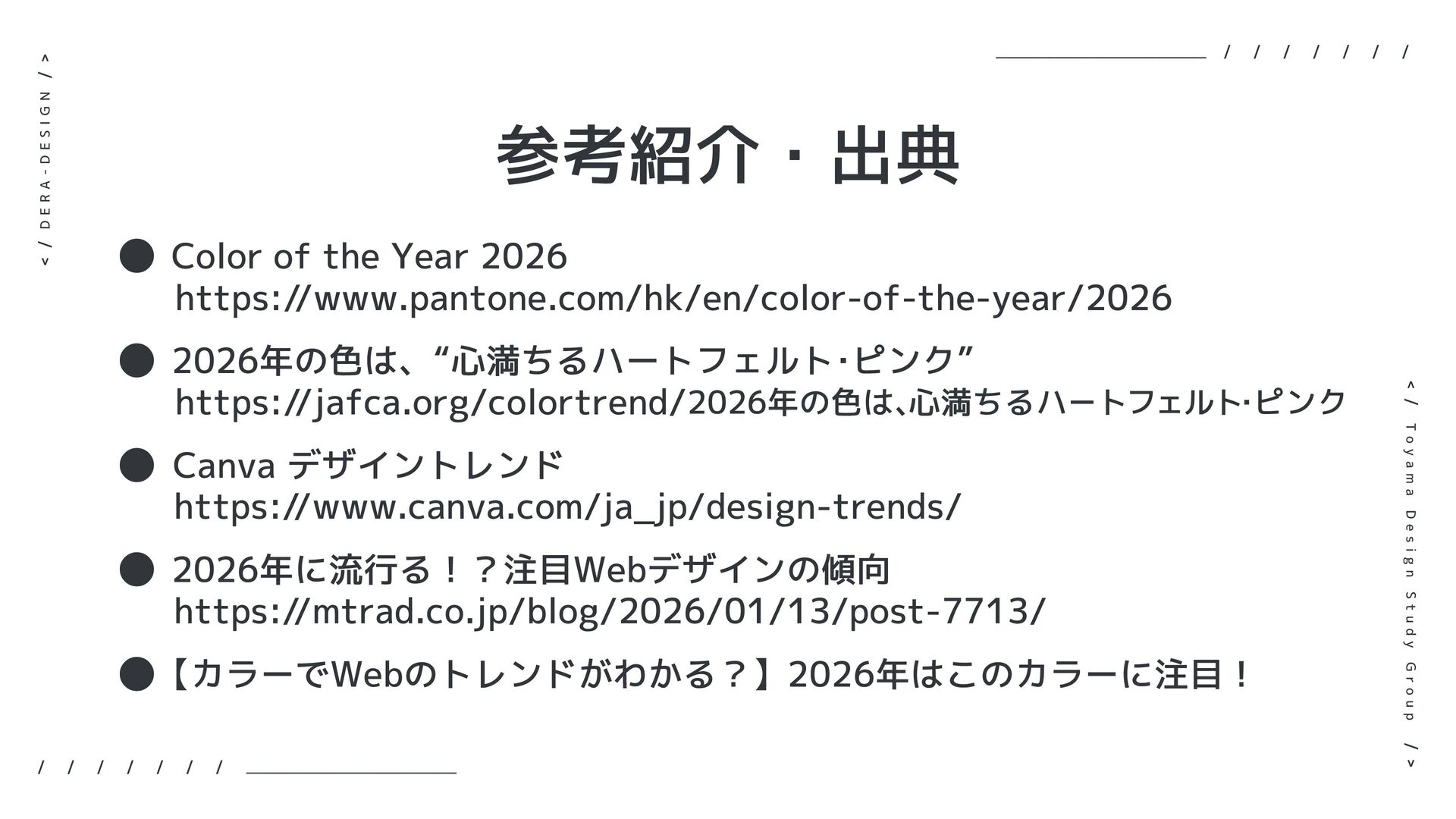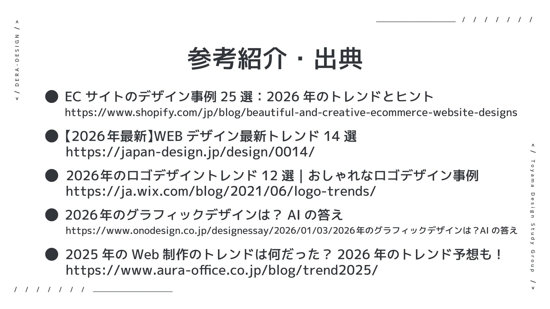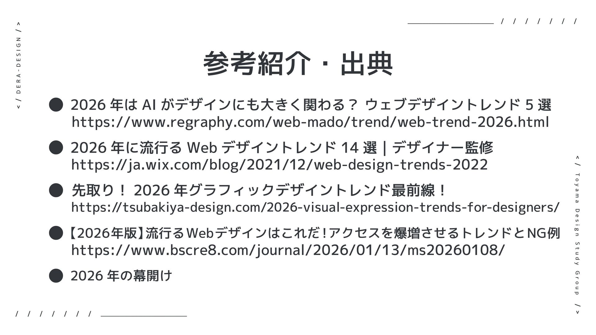 • 2026 年に流行る Web デザイントレンド 14 選|デザイナー監修 https://ja.wix.com/blog/2021/12/web-design-trends-2022 • 先取り! 2026 年グラフィックデザイントレンド最前線! https:/ /tsubakiya-design.com/2026-visual-expression-trends-for-designers/ • 【2026年版】 流行るWebデザインはこれだ! アクセスを爆増させるトレンドとNG例 https://www.bscre8.com/journal/2026/01/13/ms20260108/ • 2026 年の幕開け 参考紹介・出典 D E R A - D E S I G N T o y a m a D e s i g n S t u d y G r o u p