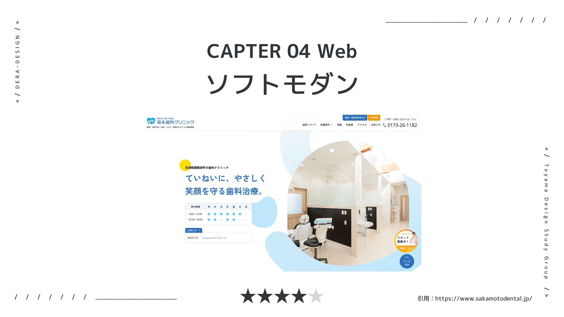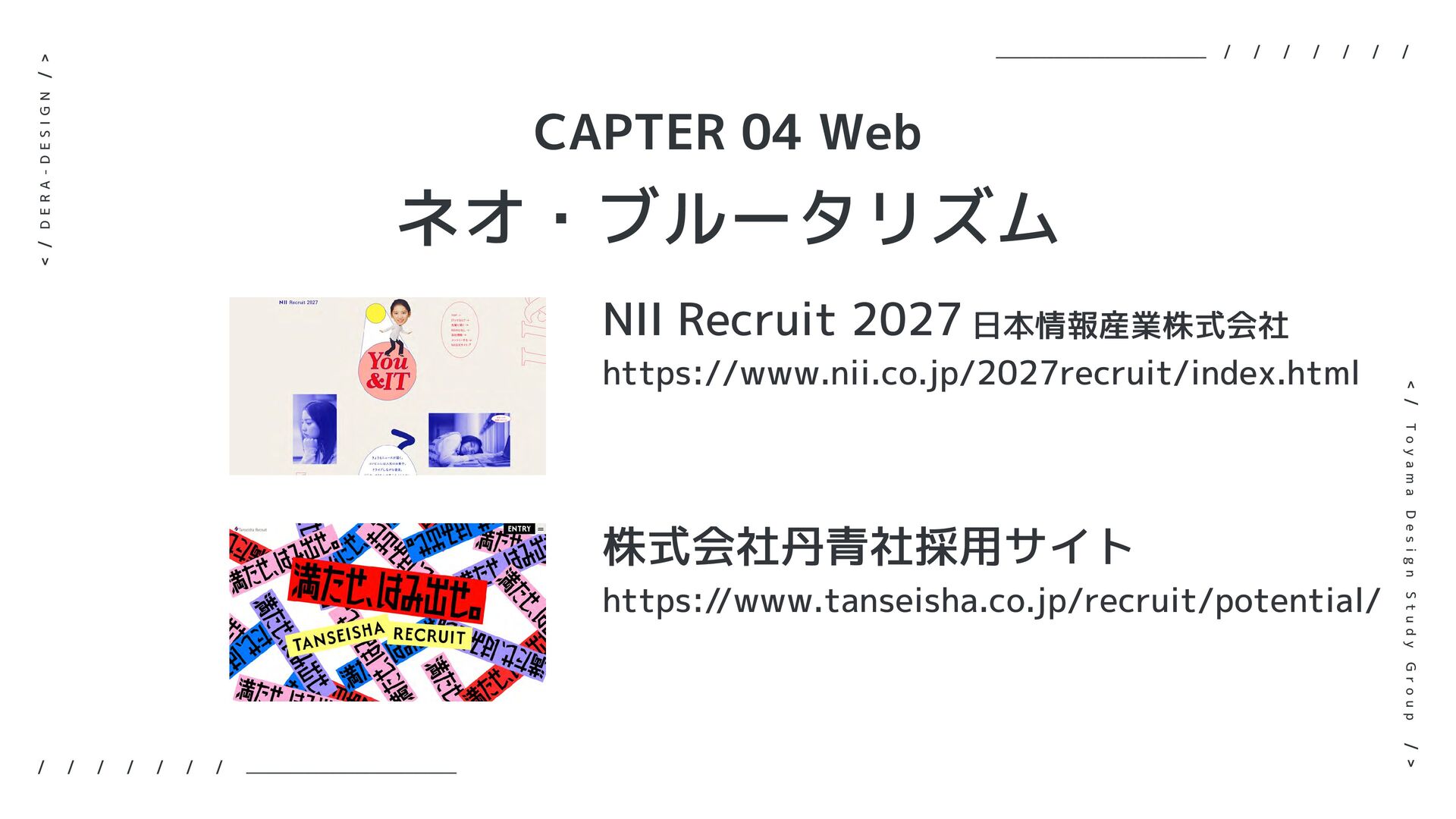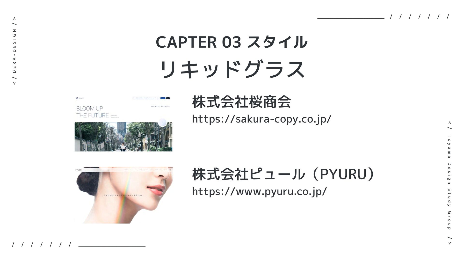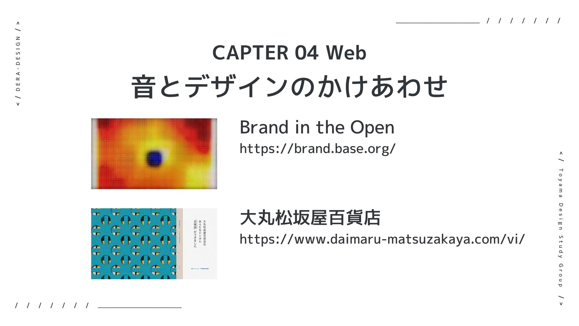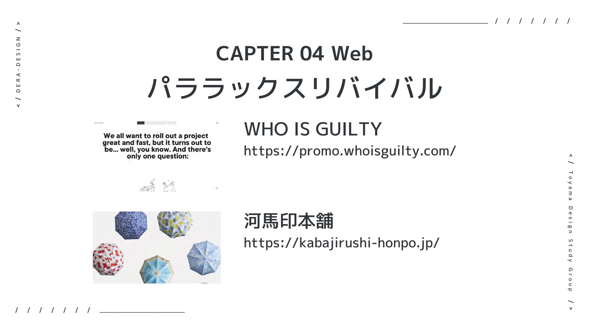 • 2026 年に流行る Web デザイントレンド 14 選|デザイナー監修 https://ja.wix.com/blog/2021/12/web-design-trends-2022 • 先取り! 2026 年グラフィックデザイントレンド最前線! https:/ /tsubakiya-design.com/2026-visual-expression-trends-for-designers/ • 【2026年版】 流行るWebデザインはこれだ! アクセスを爆増させるトレンドとNG例 https://www.bscre8.com/journal/2026/01/13/ms20260108/ • 2026 年の幕開け 参考紹介・出典 D E R A - D E S I G N T o y a m a D e s i g n S t u d y G r o u p