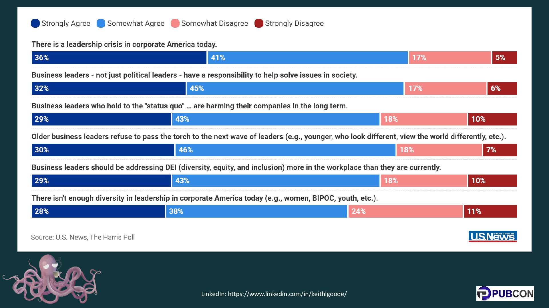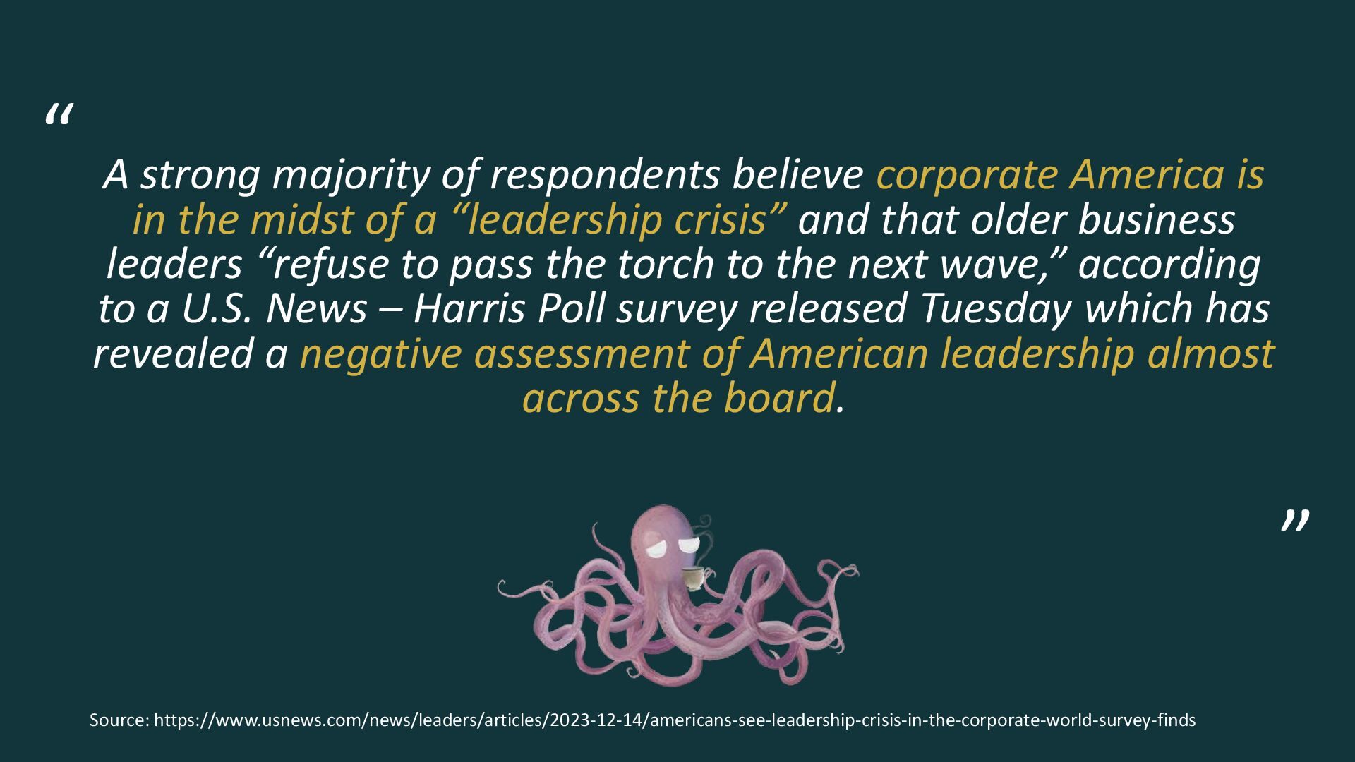 is in the midst of a “leadership crisis” and that older business leaders “refuse to pass the torch to the next wave,” according to a U.S. News – Harris Poll survey released Tuesday which has revealed a negative assessment of American leadership almost across the board. Source: https://www.usnews.com/news/leaders/articles/2023-12-14/americans-see-leadership-crisis-in-the-corporate-world-survey-finds