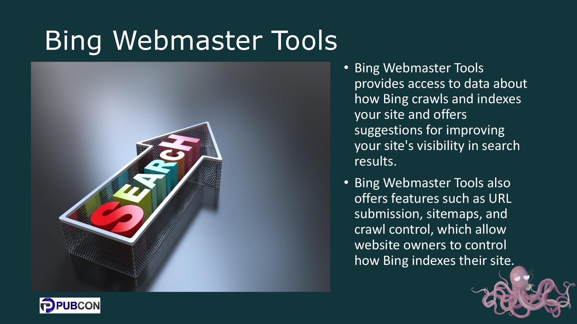 data about how Bing crawls and indexes your site and offers suggestions for improving your site's visibility in search results. • Bing Webmaster Tools also offers features such as URL submission, sitemaps, and crawl control, which allow website owners to control how Bing indexes their site.