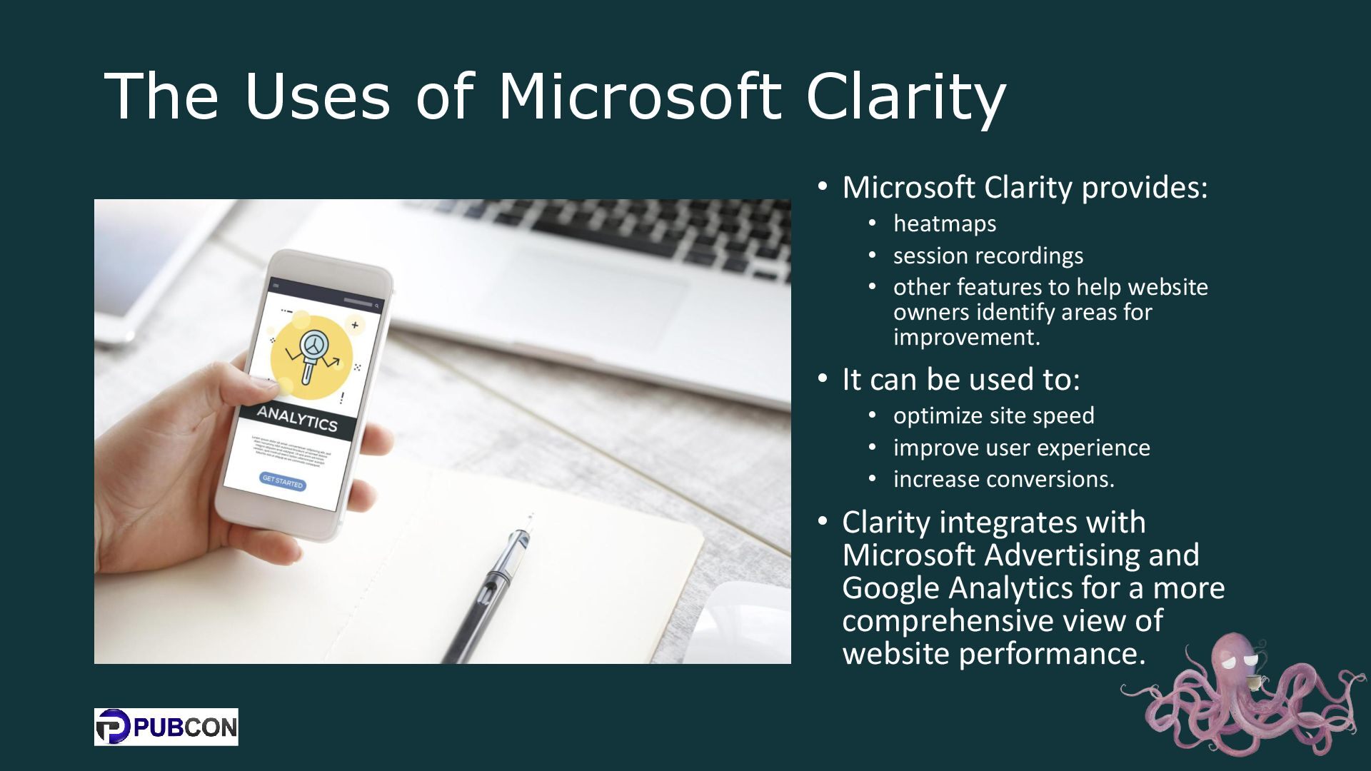heatmaps • session recordings • other features to help website owners identify areas for improvement. • It can be used to: • optimize site speed • improve user experience • increase conversions. • Clarity integrates with Microsoft Advertising and Google Analytics for a more comprehensive view of website performance.