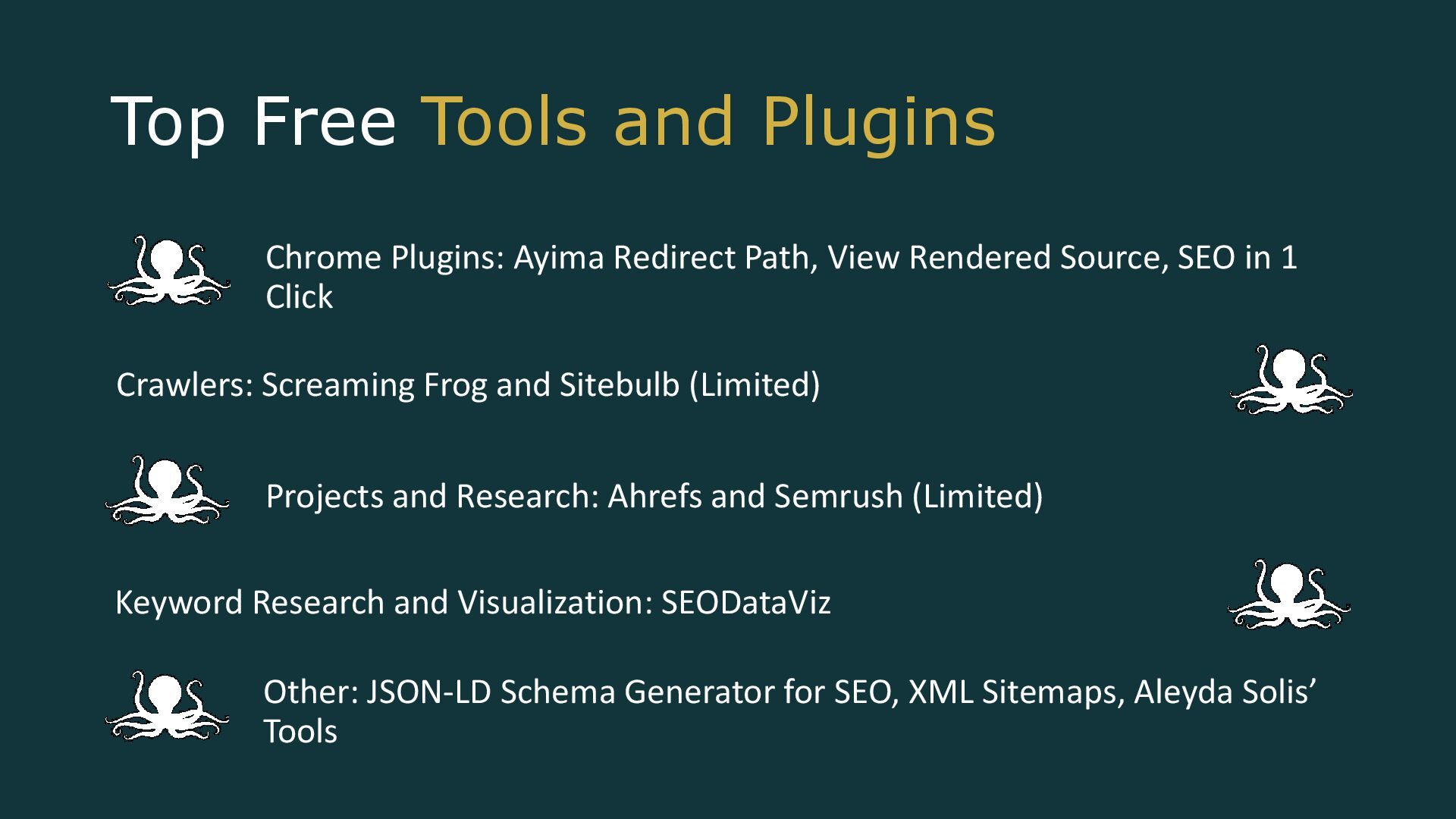View Rendered Source, SEO in 1 Click Other: JSON-LD Schema Generator for SEO, XML Sitemaps, Aleyda Solis’ Tools Projects and Research: Ahrefs and Semrush (Limited) Crawlers: Screaming Frog and Sitebulb (Limited) Keyword Research and Visualization: SEODataViz