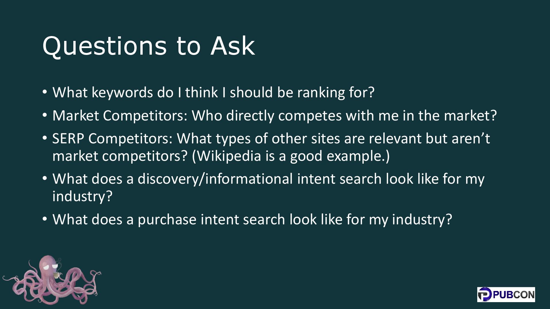 should be ranking for? • Market Competitors: Who directly competes with me in the market? • SERP Competitors: What types of other sites are relevant but aren’t market competitors? (Wikipedia is a good example.) • What does a discovery/informational intent search look like for my industry? • What does a purchase intent search look like for my industry?