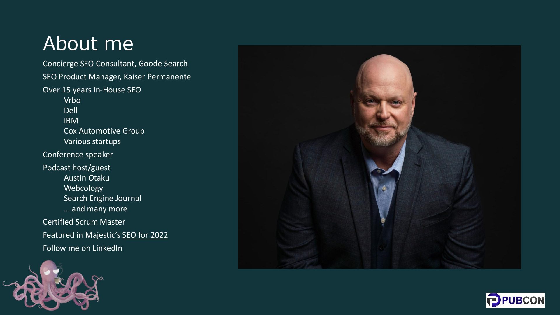 Kaiser Permanente Over 15 years In-House SEO Vrbo Dell IBM Cox Automotive Group Various startups Conference speaker Podcast host/guest Austin Otaku Webcology Search Engine Journal … and many more Certified Scrum Master Featured in Majestic’s SEO for 2022 Follow me on LinkedIn
