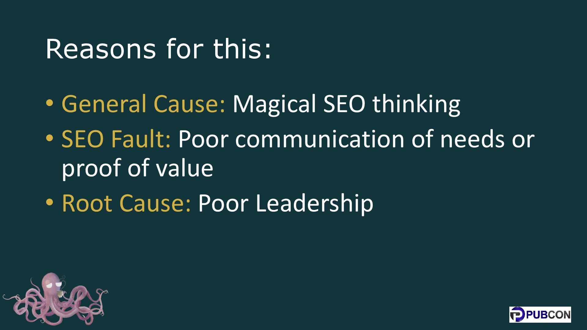 SEO Fault: Poor communication of needs or proof of value • Root Cause: Poor Leadership