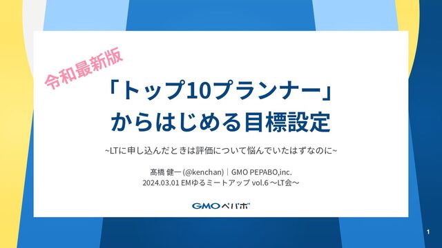 1 「トップ10プランナー」 からはじめる⽬標設定 ~LTに申し込んだときは評価について悩んでいたはずなのに~ 髙橋 健⼀ (@kenchan)|GMO PEPABO,inc. 2024.03.01 EMゆるミートアップ