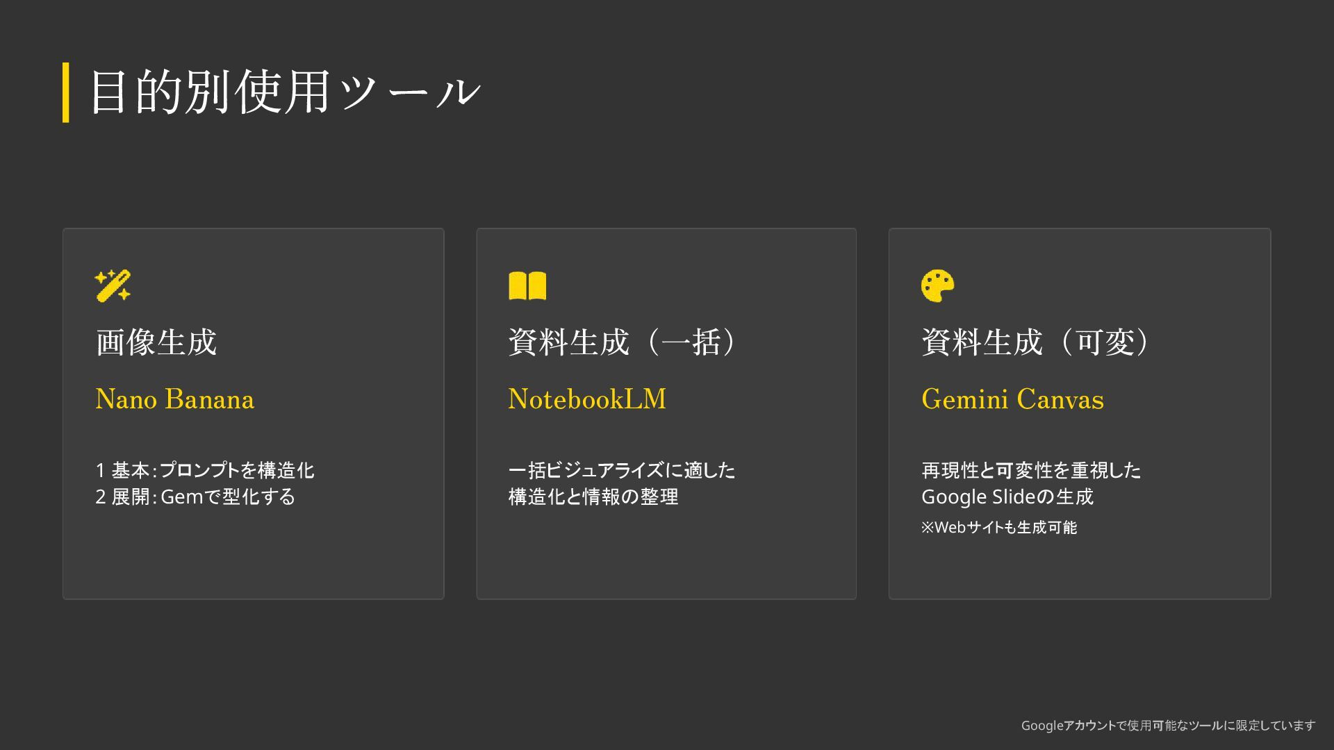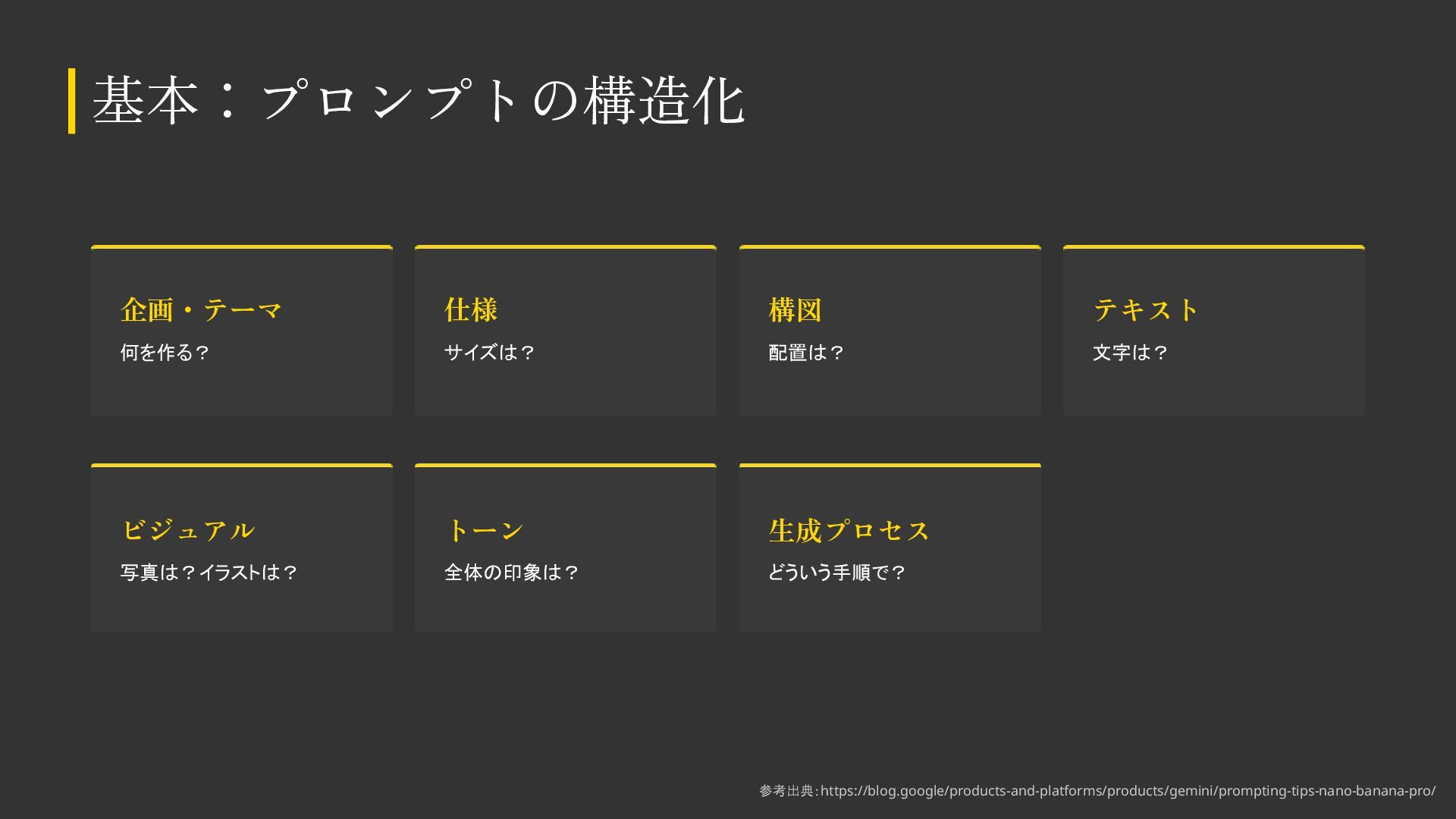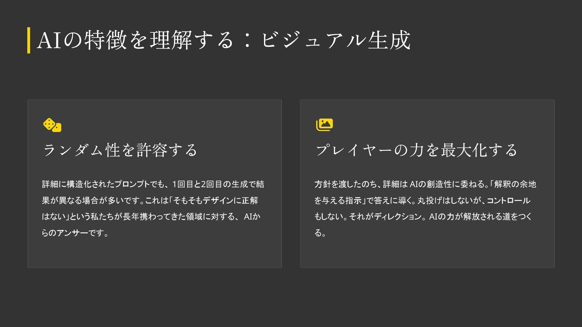 AIをデザイン制作で活用する際の基本知識・考え方をまとめました。 デザイナーの方も、デザイナー以外の方もご覧いただける内容になっています。 ※こちらのスライドは「Gemini Canvas」で生成しました。