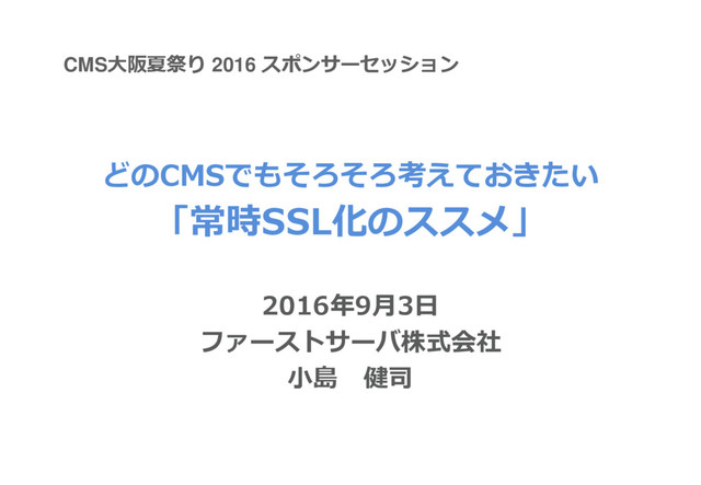 どのCMSでもそろそろ考えておきたい 「常時SSL化のススメ」 2016年9月3日 ファーストサーバ株式会社 小島 健司 CMS大阪夏祭り 2016 スポンサーセッション
