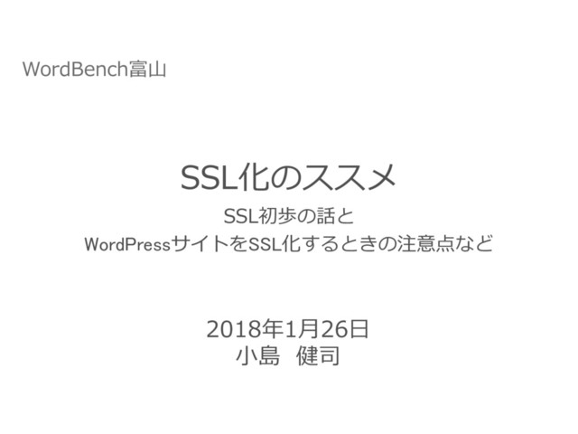 SSL化のススメ SSL初歩の話と WordPressサイトをSSL化するときの注意点など 2018年1月26日 小島 健司 WordBench富山
