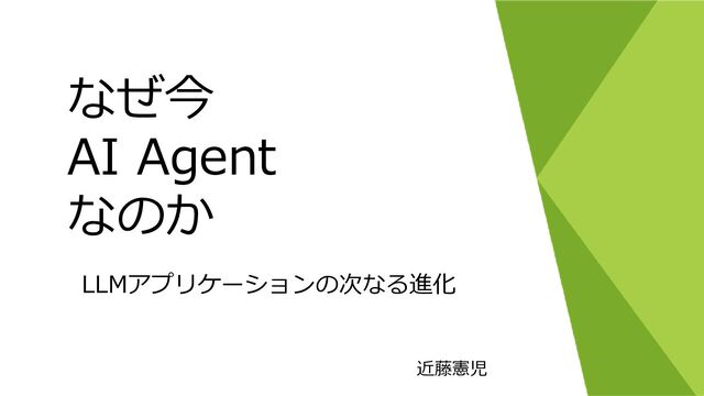 NTTデータ • … 注目プロダクト • Perplexity • GenSpark • FeloAI • Cursor • Dify • … 急速に広がる AI Agent https://jp.reuters.com/business/technology/6RXM3NLXNZOQDPY3OB7R6A77BY-2024-10-21/ https://aws.amazon.com/jp/what-is/ai-agents/ https://pr.fujitsu.com/jp/news/2024/10/23.html https://www.nttdata.com/global/ja/news/release/2024/102401/